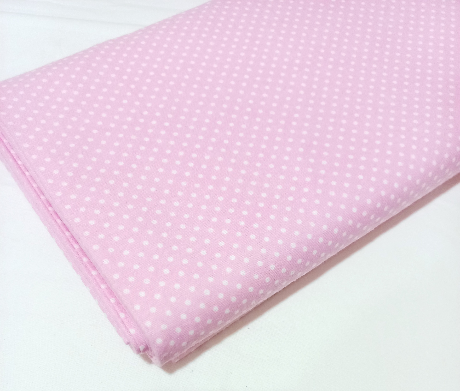 Tecido de Flanela, 100% algodão com bolinhas brancas em fundo rosa.