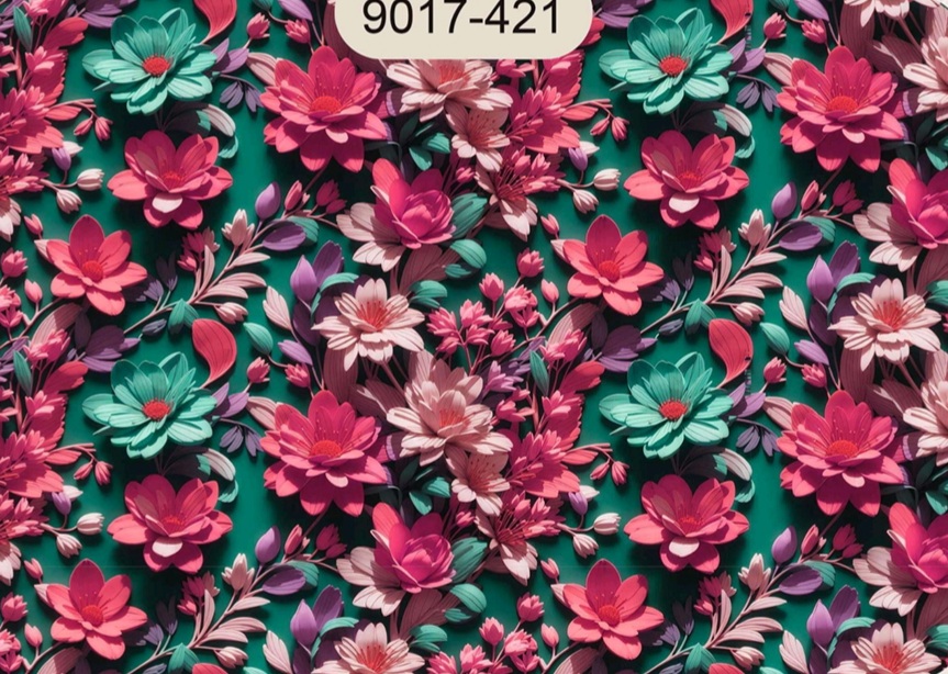 Tecido 100% algodão com motivos florais em 3D, fundo verde.