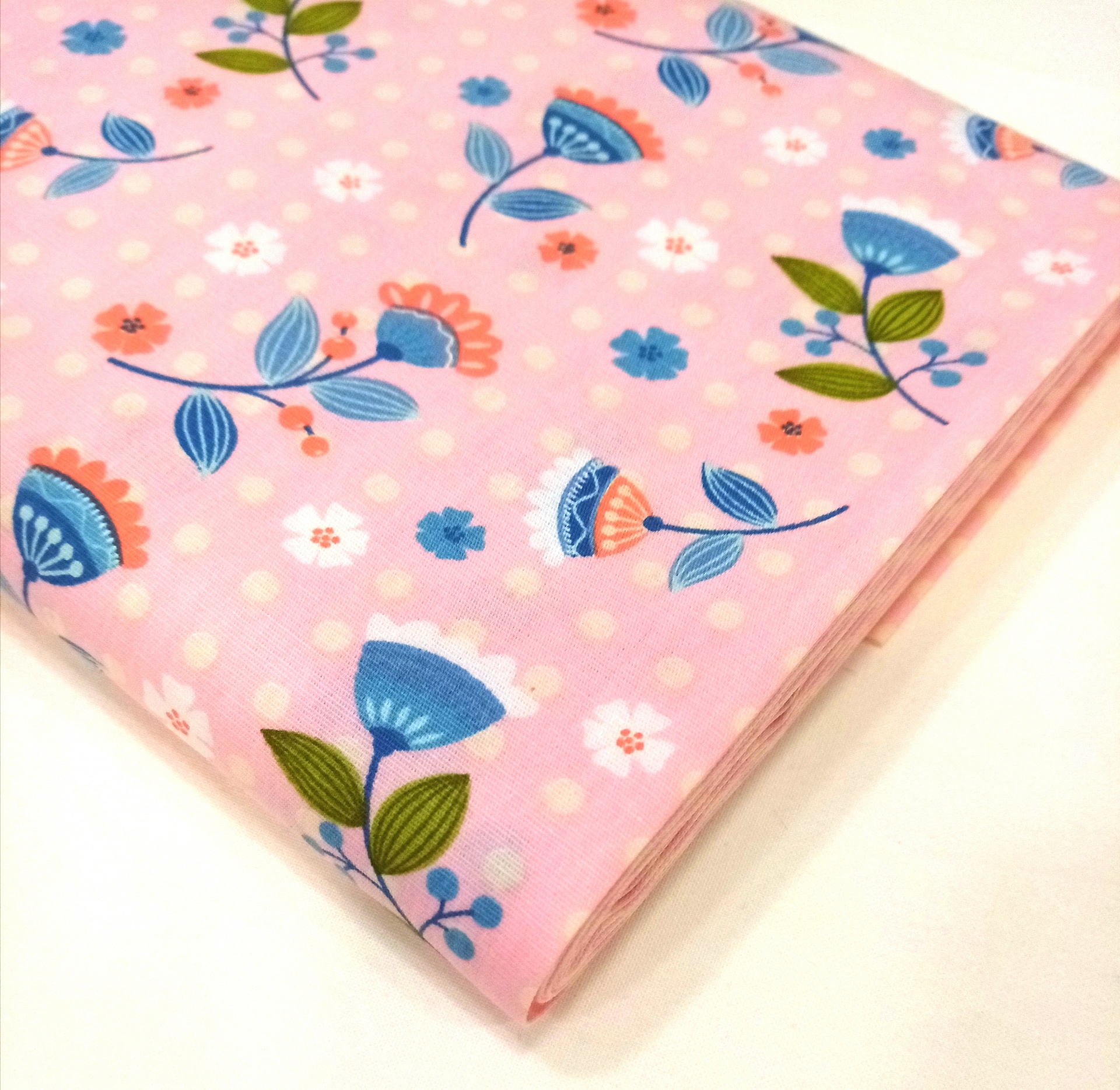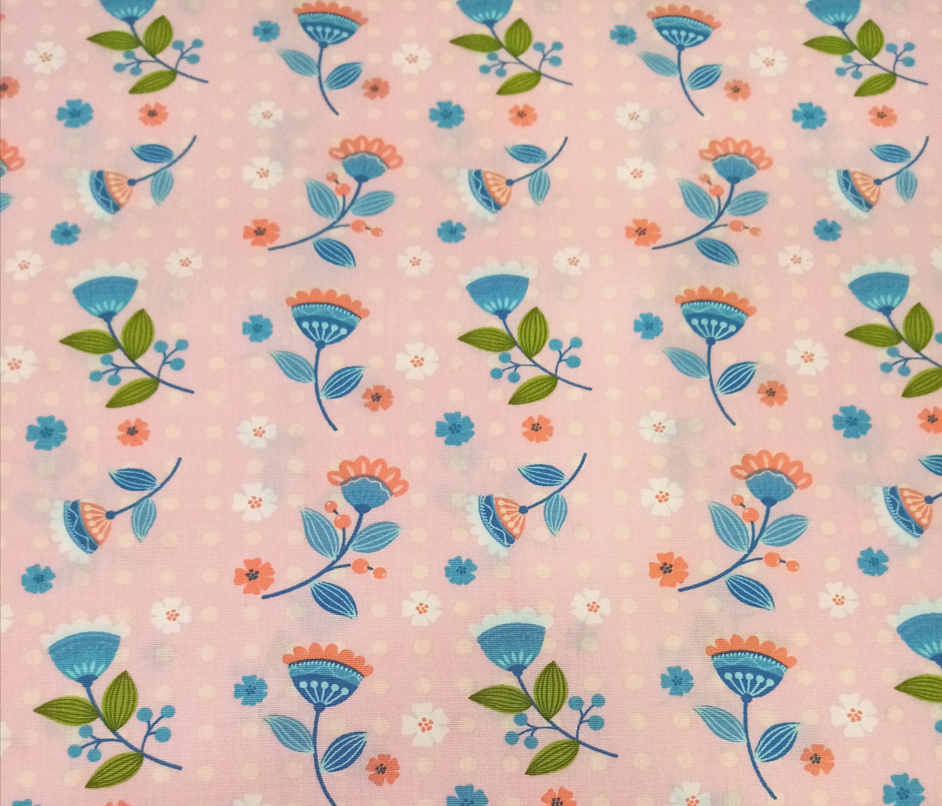 Tricoline Fabricart 100% algodão com flores azuis em fundo rosa.