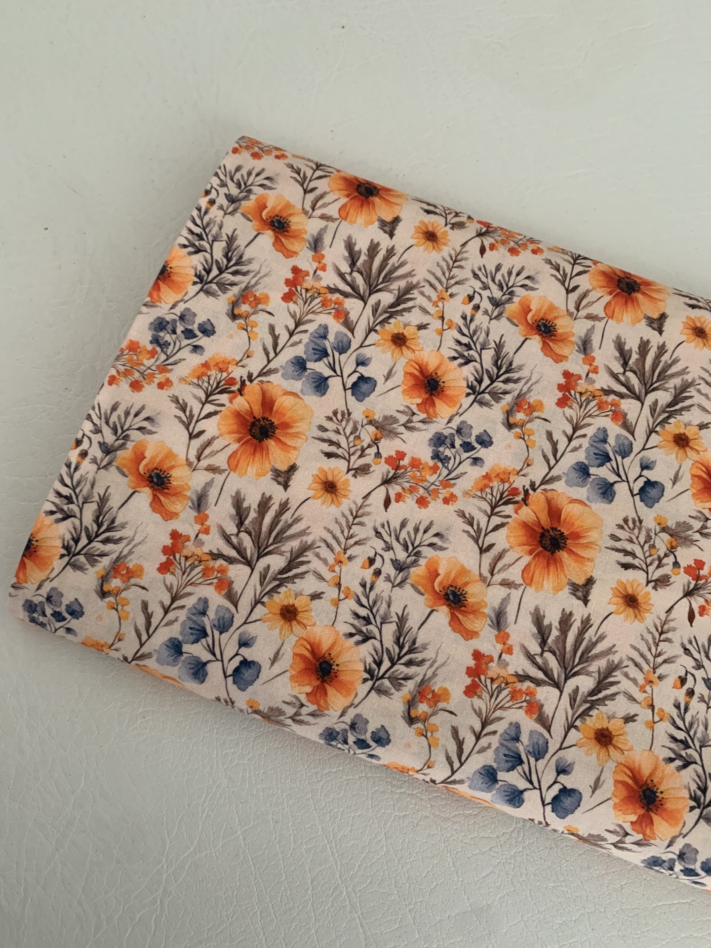 Tricoline 100% algodão, com flores em tons de laranja e azul em fundo creme