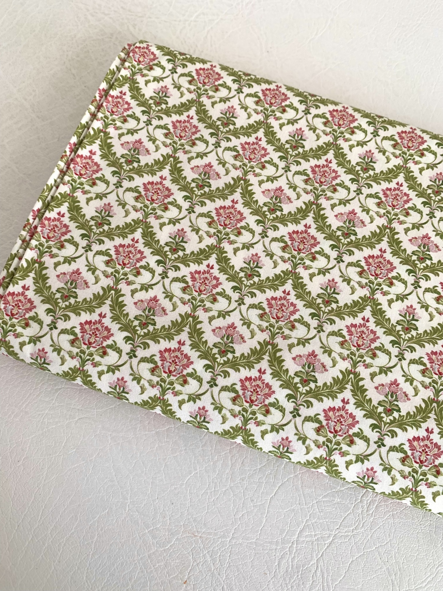 Tecido100% algodão, com flores em tons de rosa e verde azeitona em fundo pérola.
