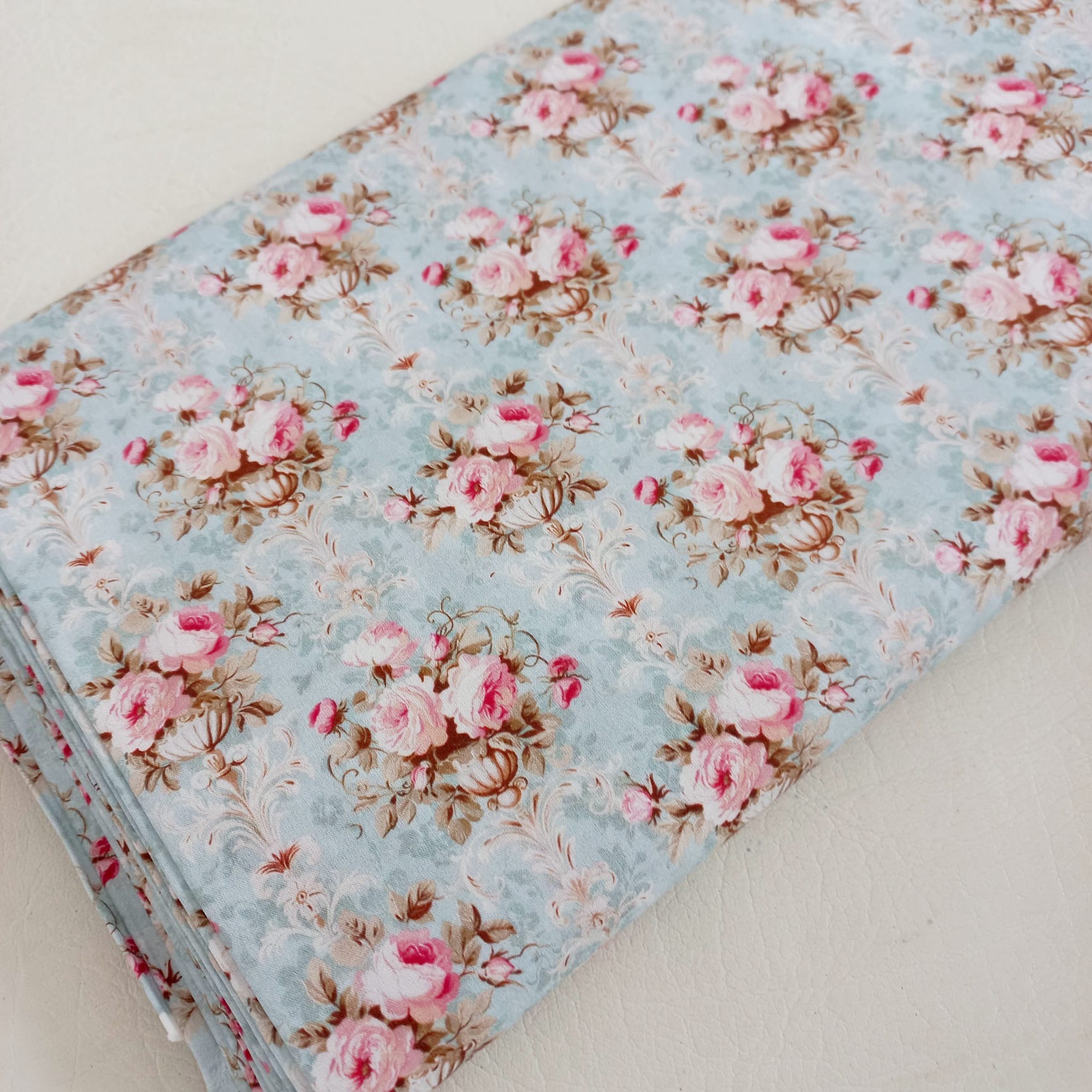 Tecido100% algodão, com rosas em fundo azul.
