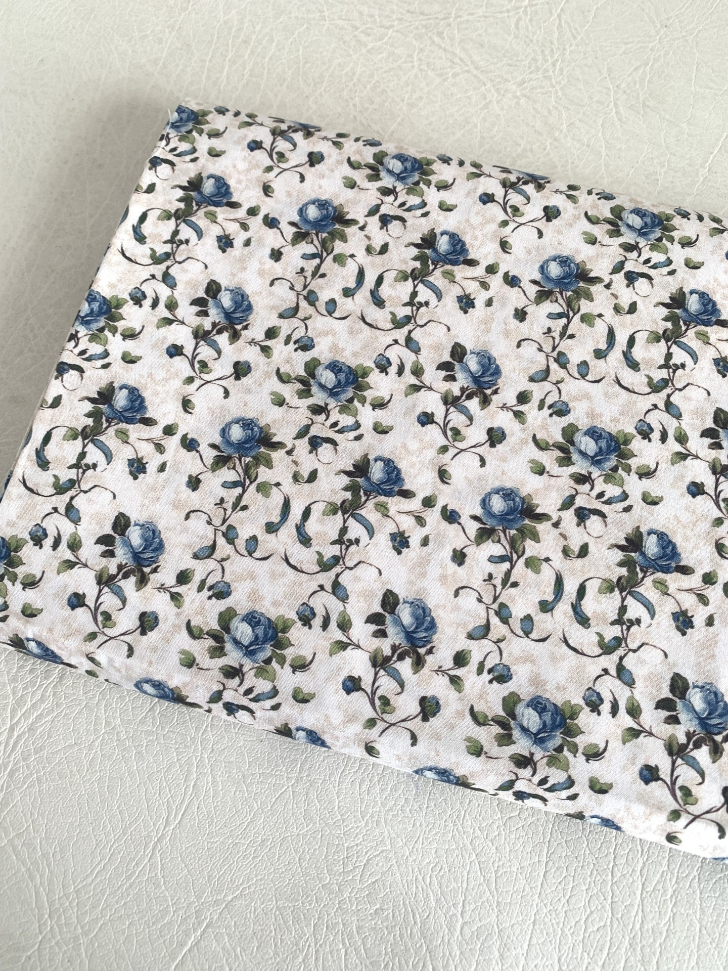 Tecido100% algodão, com rosas em tons de azul em fundo pérola.