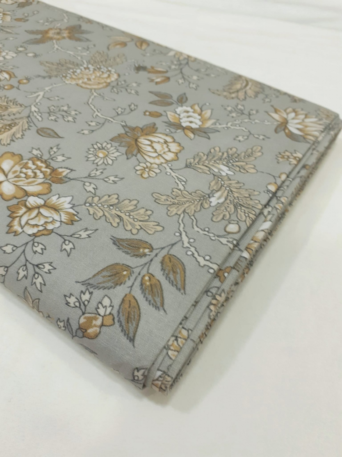 Popeline 100% algodão ôrganico com flores ocre em tons de cinza.