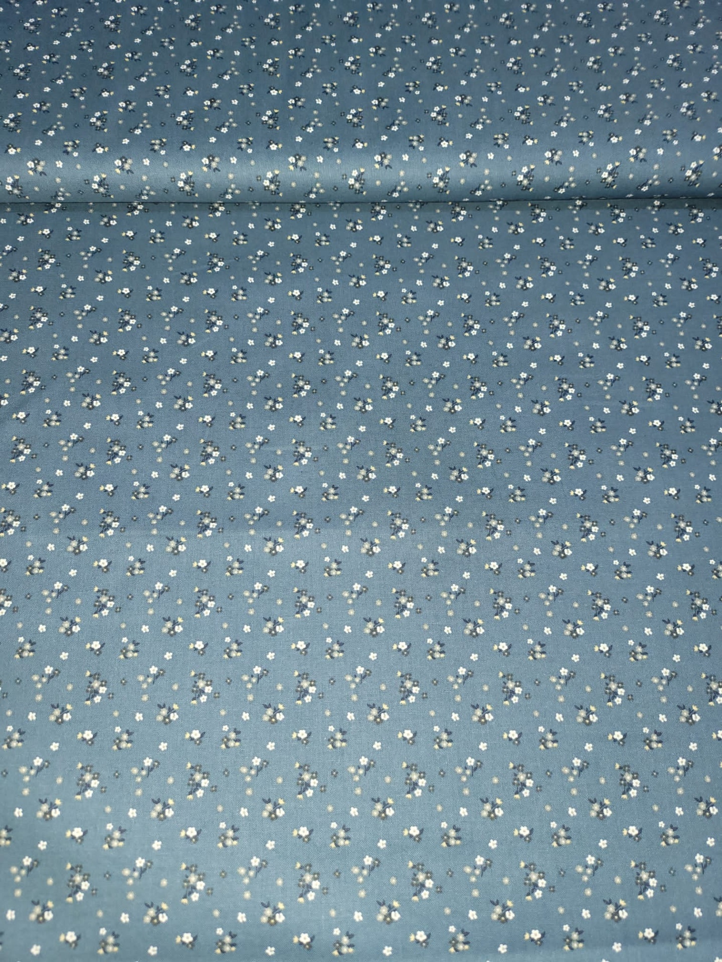 Popeline 100% algodão, com florzinhas em fundo azul ganga.