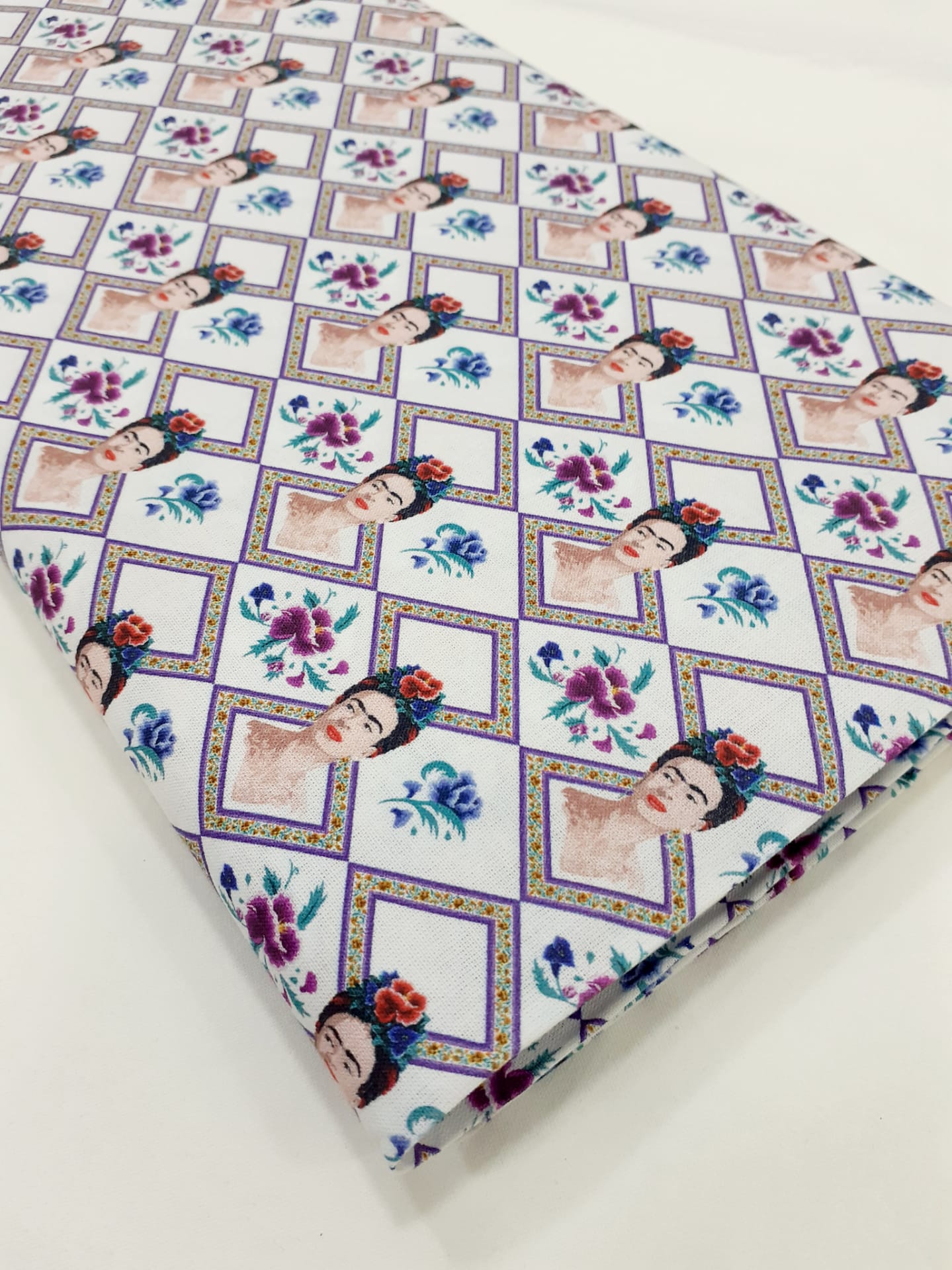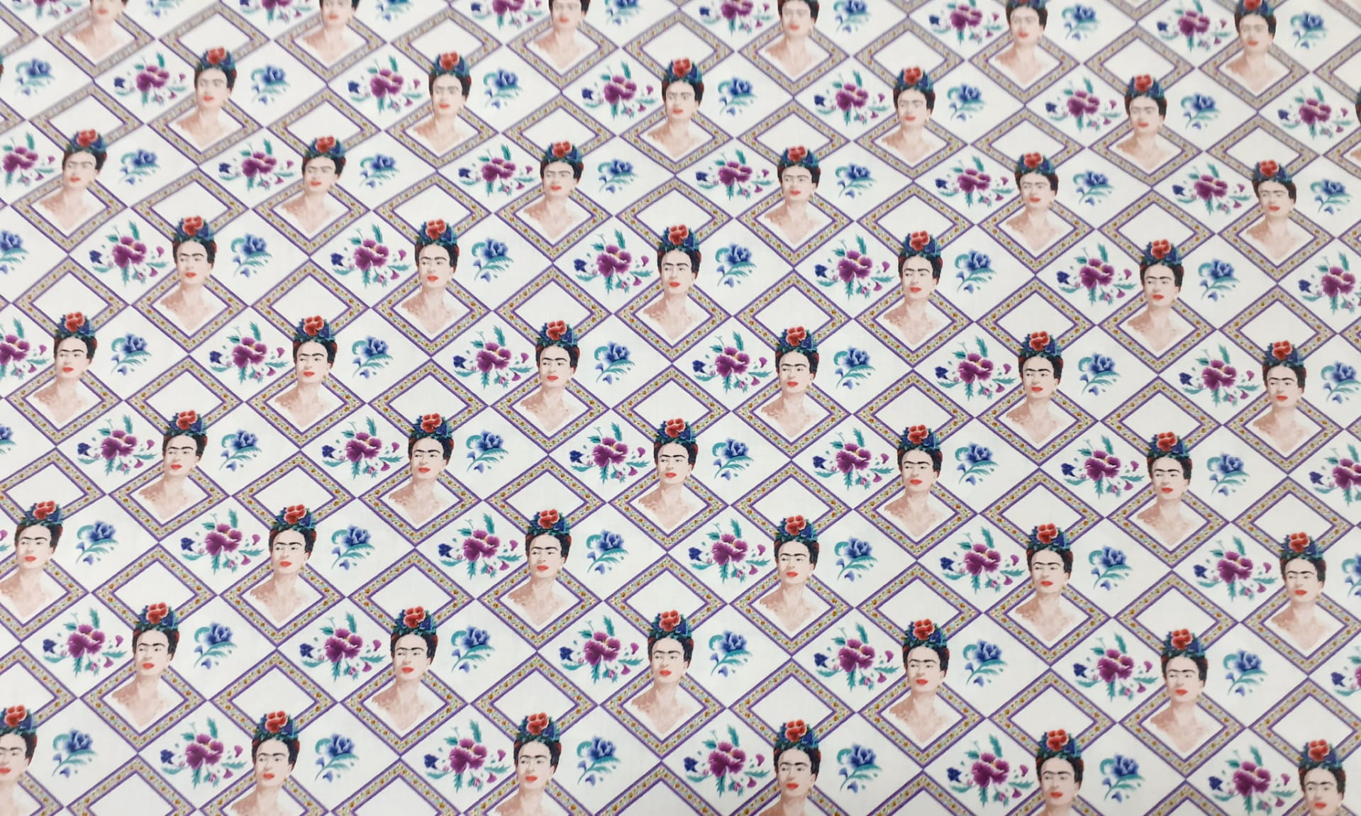 Frida Kahlo Floral e Losangos Azul Violeta 0,12 € Partilhar Adicionar Contactar 165 unidades em stock Tecido 100% algodão com a Frida Kahlo em fundo branco 1.50m de largo Corte mínimo 20cm