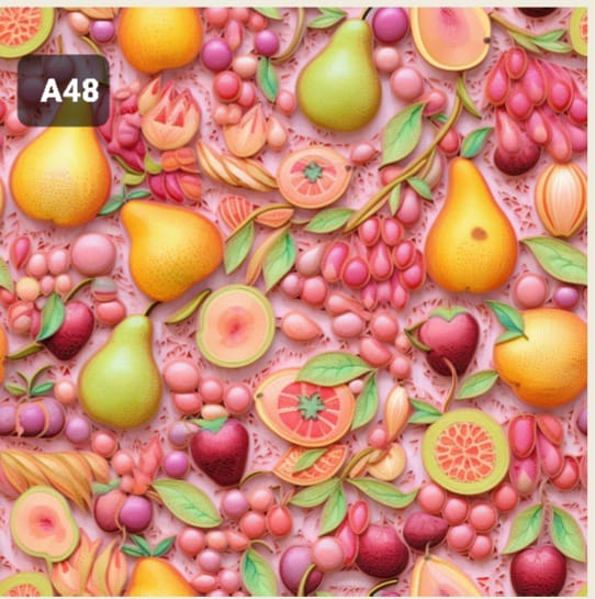 Tricoline 100% algodão com várias frutas em 3D em tons coloridos.