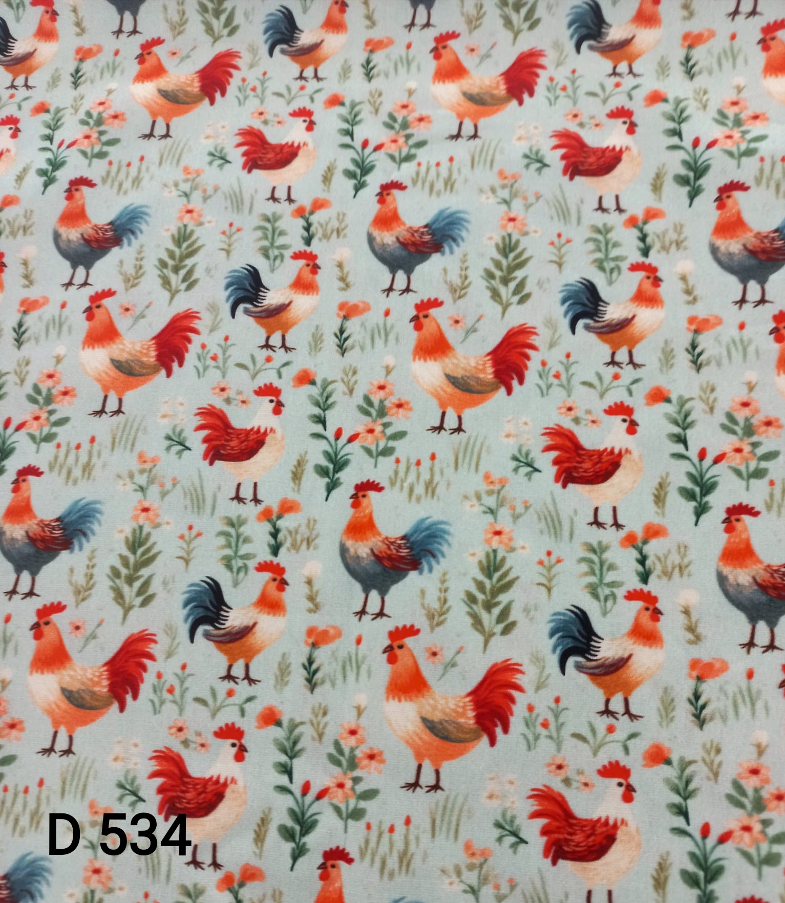 Tricoline Fabricart 100% algodão com galinhas coloridas em fundo verde água.