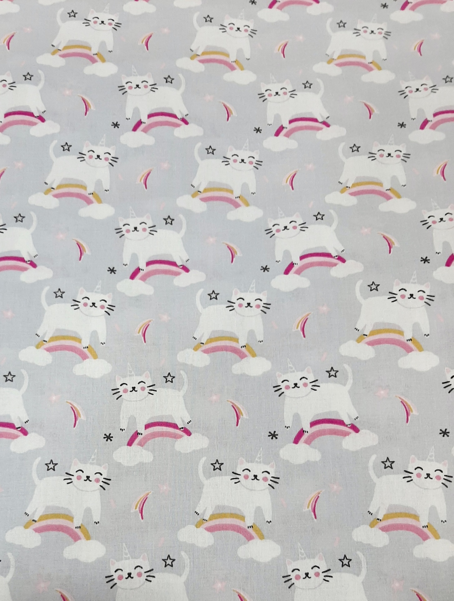 Popeline Le Tissu by Domotex 100% algodão com gatinhos e unicórnios em fundo cinza