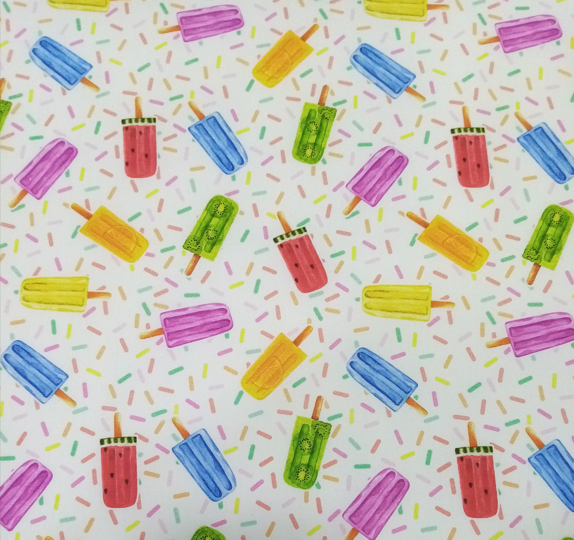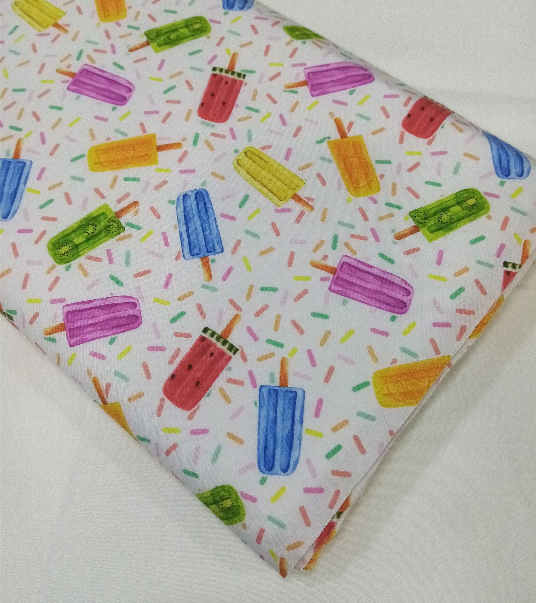 Percal 100% algodão, com gelados coloridos em fundo branco.