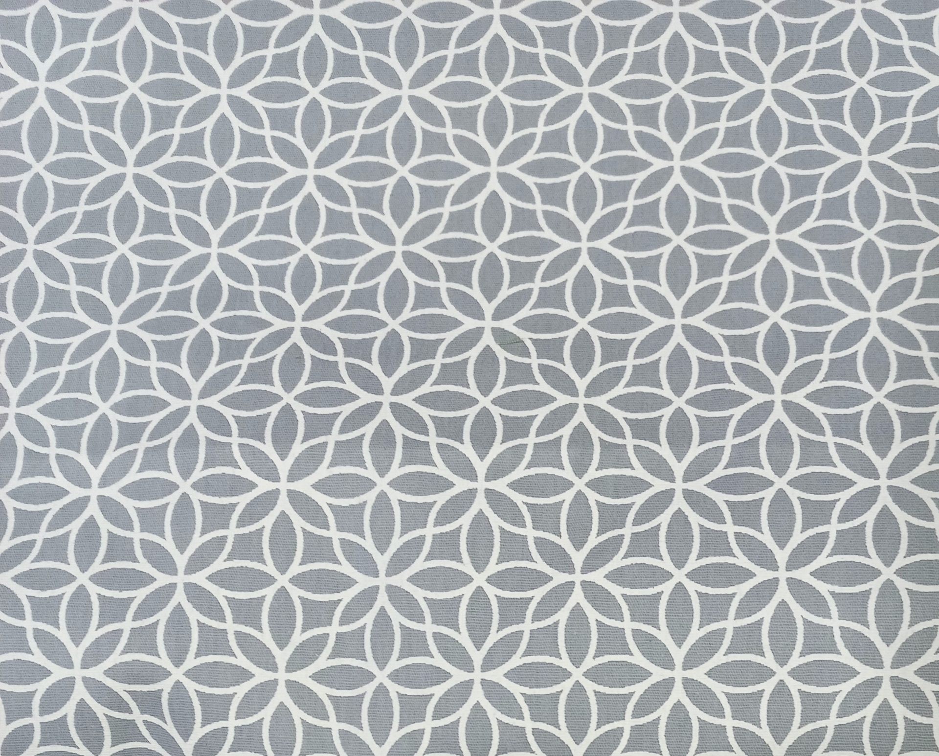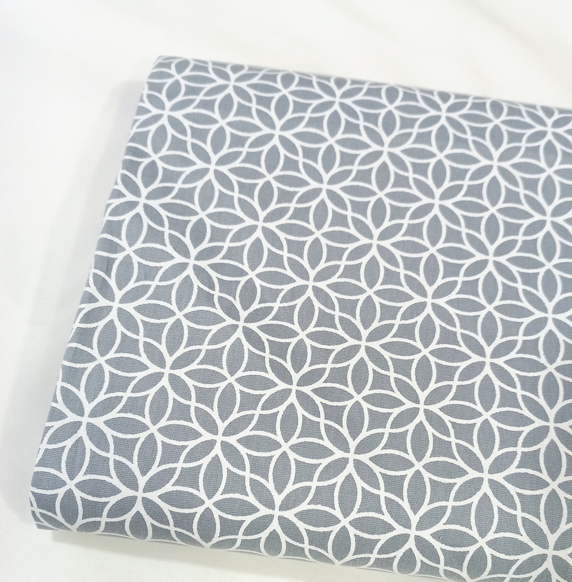 Tricoline 100% algodão com figuras geométricas brancas em fundo cinza.