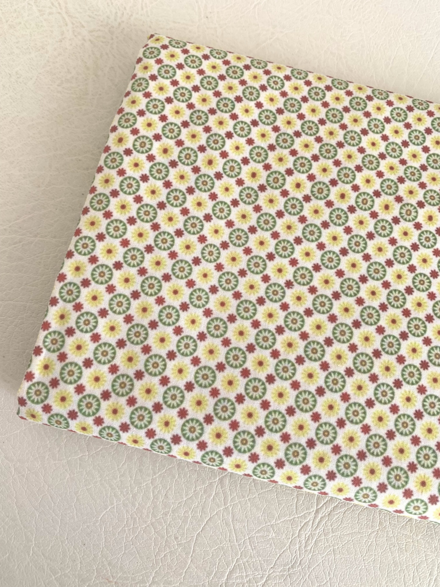 Percal 100% algodão com figuras geométricas em tons de verde seco e rosa em fundo branco.
