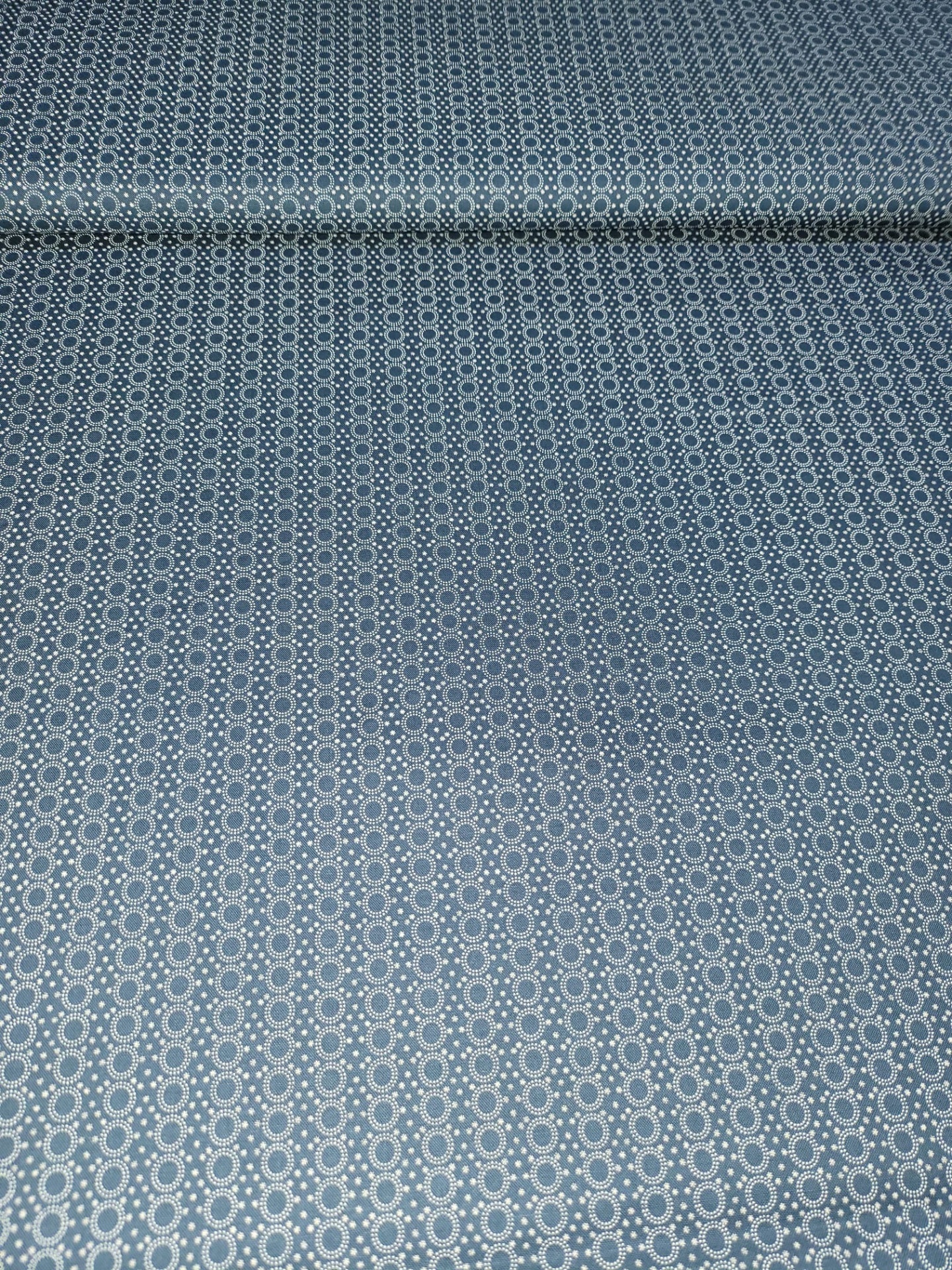 Popeline 100% algodão, com motivos geométricos em fundo azul ganga.