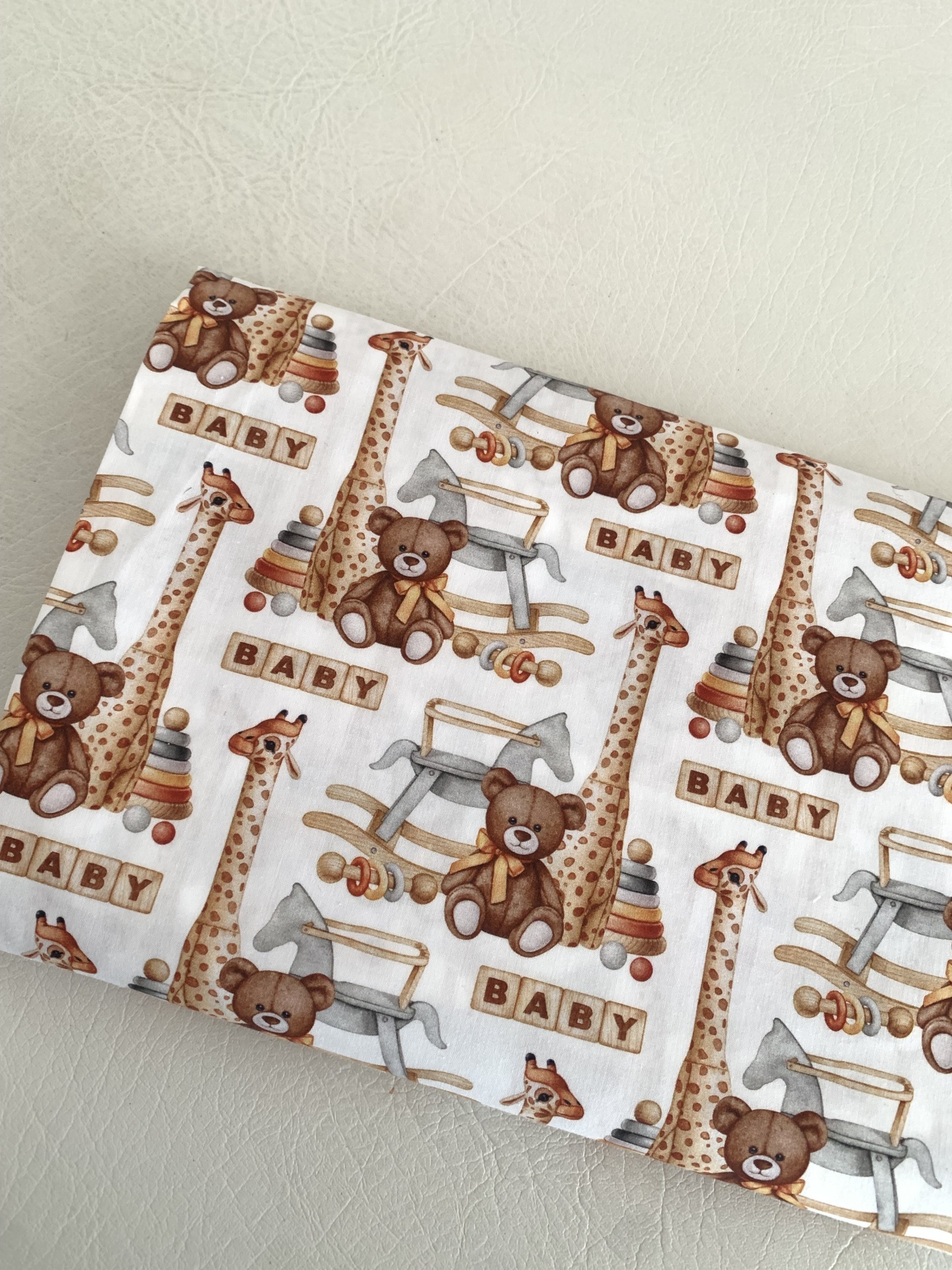 Tecido 100% Algodão , com girafas e ursinhos em fundo branco.