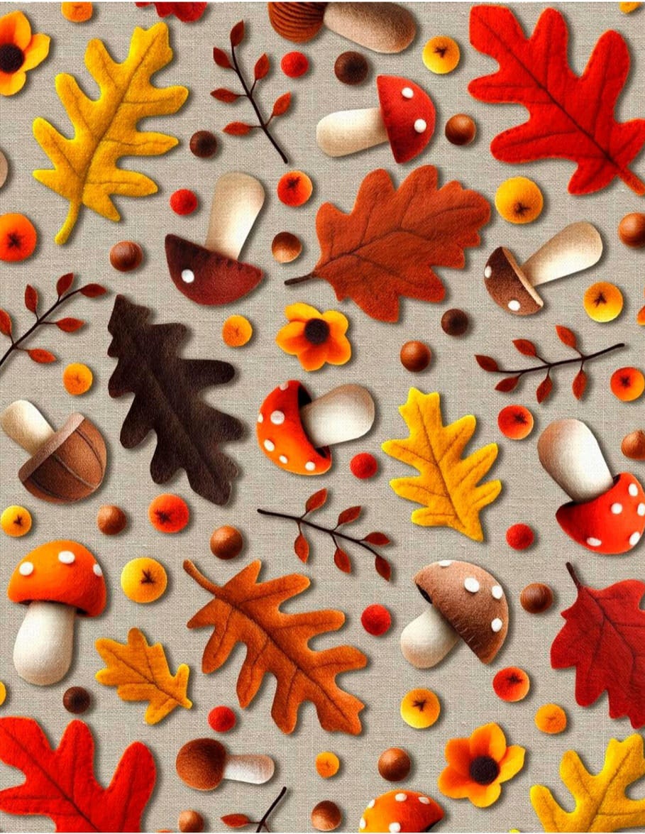 Half Panamá 100% algodão com cogumelos e folhas em tons outonais em fundo creme..