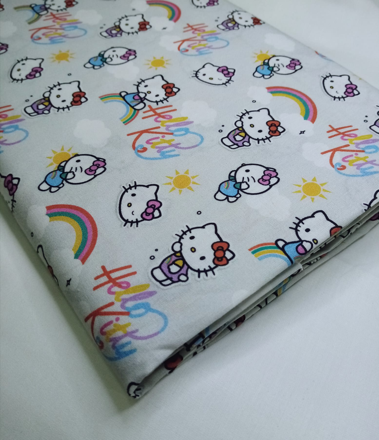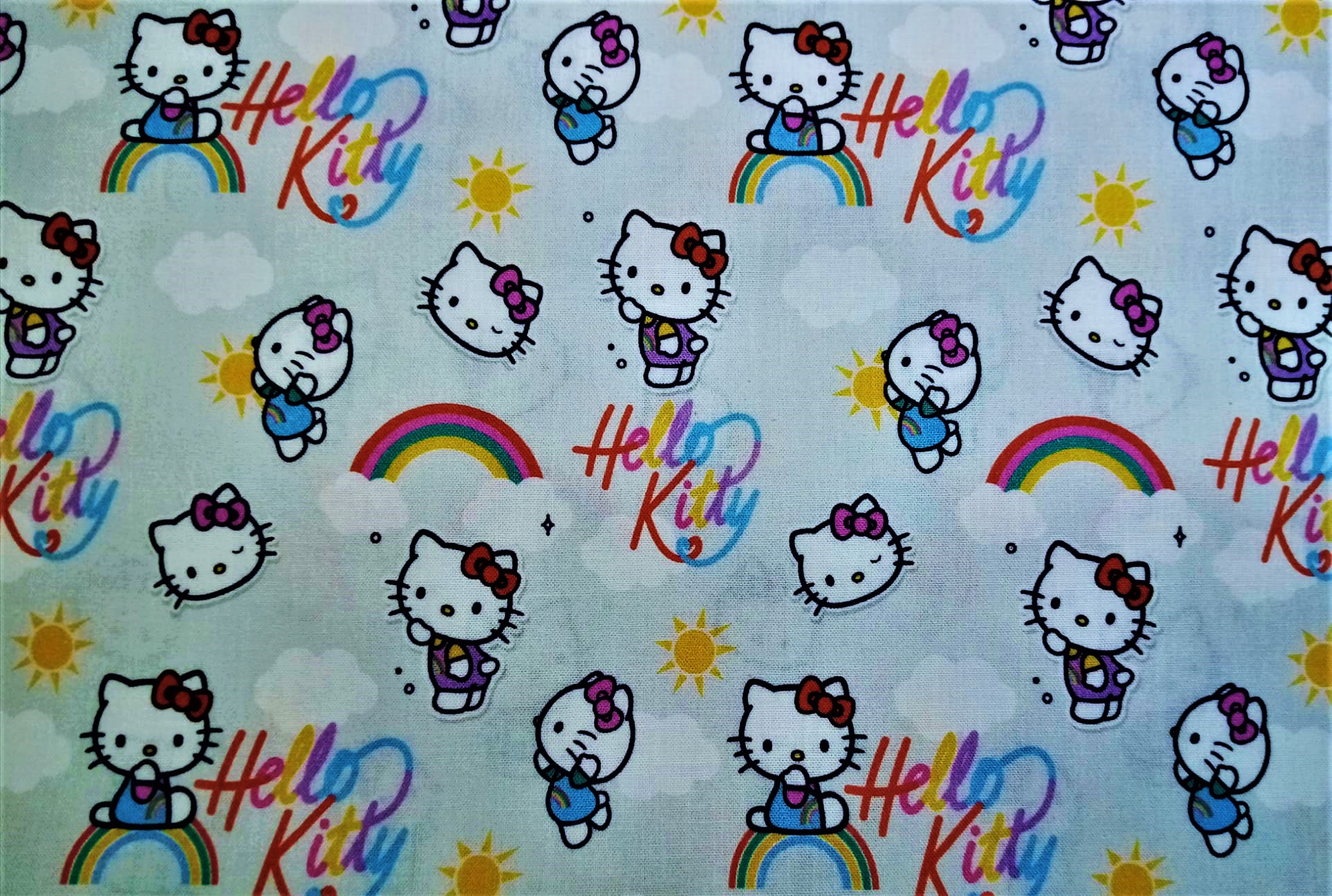Tecido 100% algodão com a Hello Kitty com arco-íris em fundo cinza claro