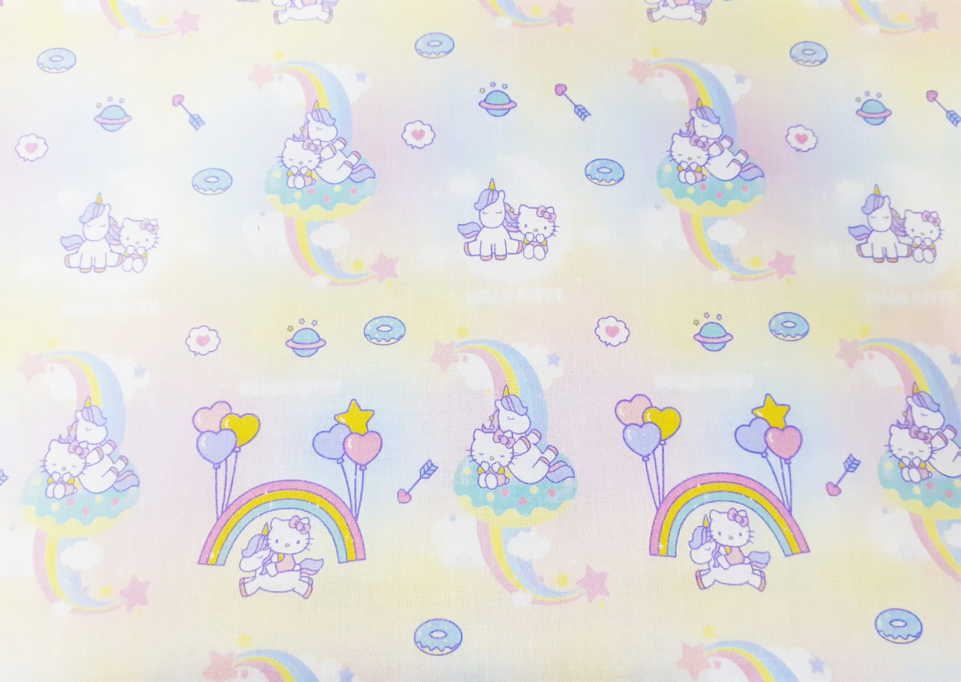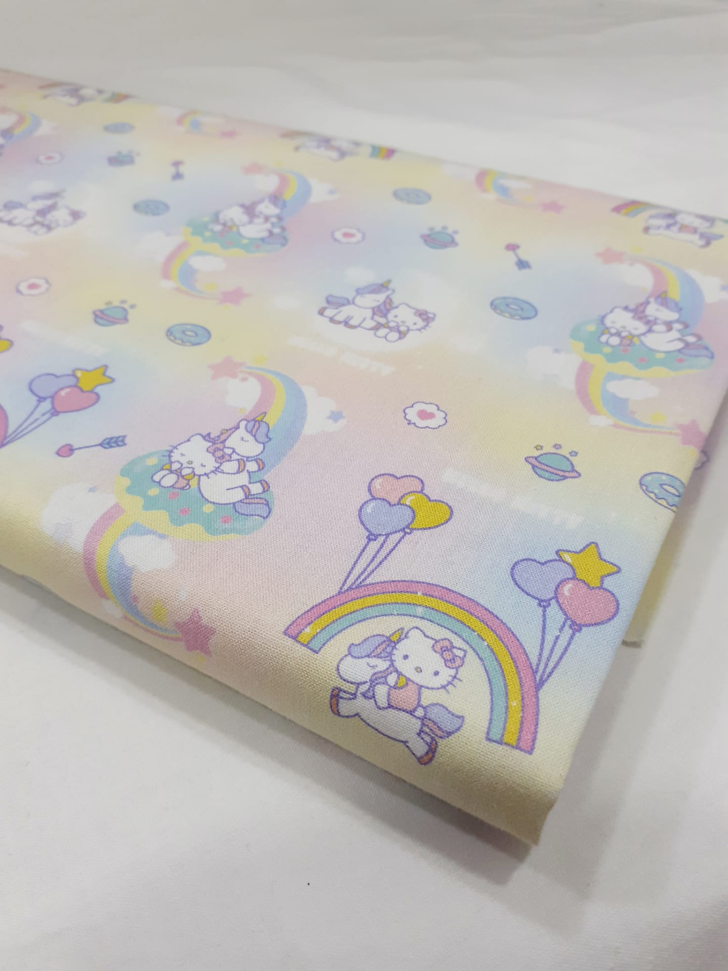 Tecido 100% algodão com a Hello Kitty e Unicórnios em fundo arco-íris.