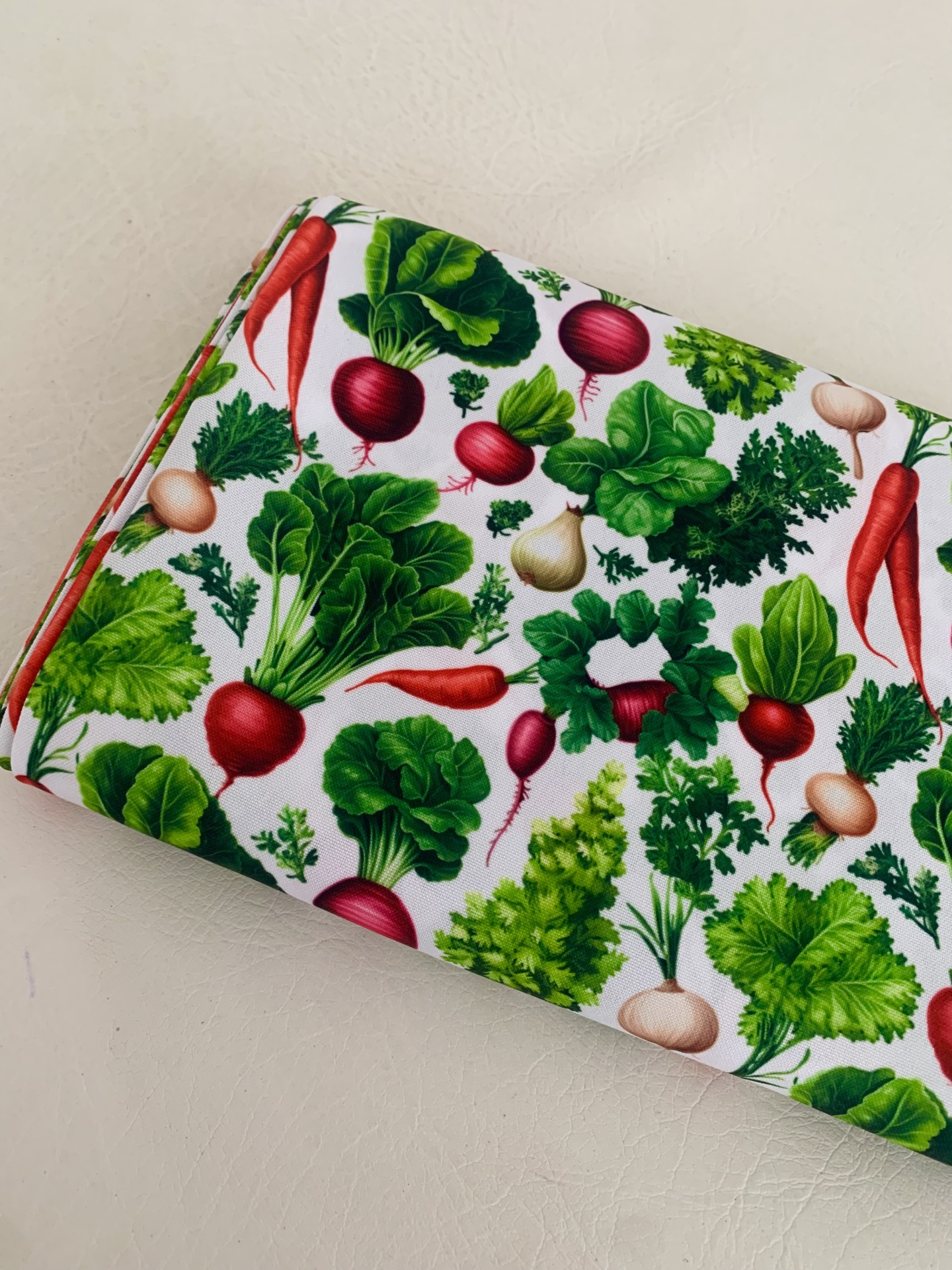 Tecido minimate impermeável, com hortícolas em fundo branco.
