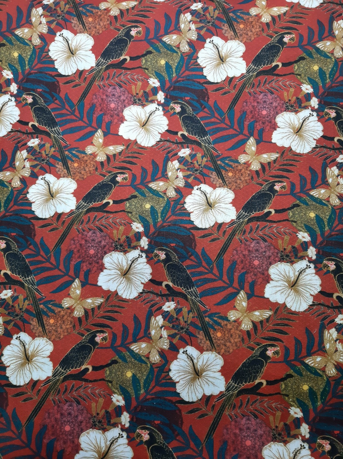 Jakarta 1 Aves 0,14 € Partilhar Adicionar Contactar Tecido Stof Fabrics 100% algodão com flores e papagaios em fundo cor de tijolo 1.15m de largo 110gr/m² Corte minimo 20cm Certificação Oeko-Tex Standard 100 Classe I - Texteis livres de substâncias nocivas
