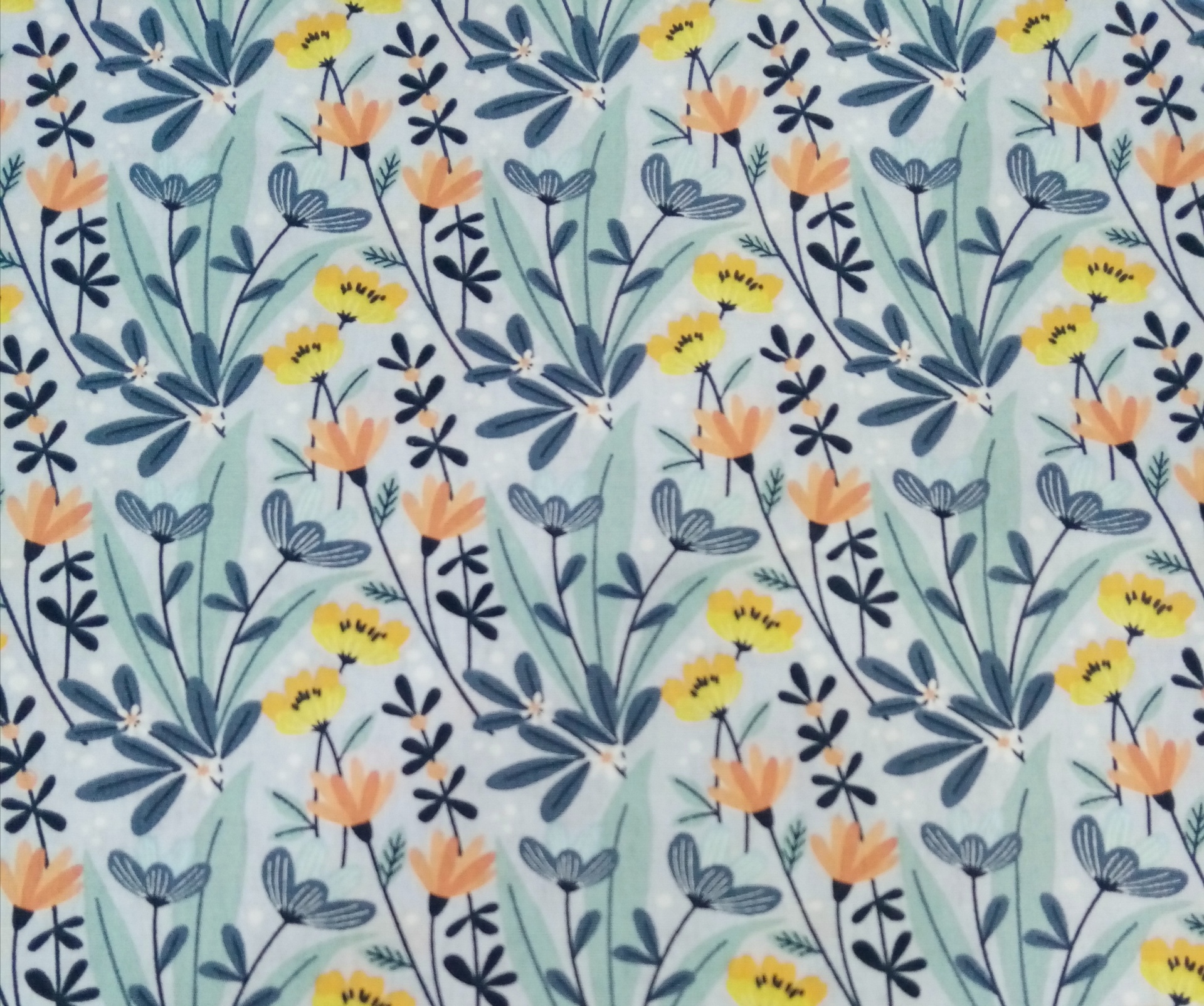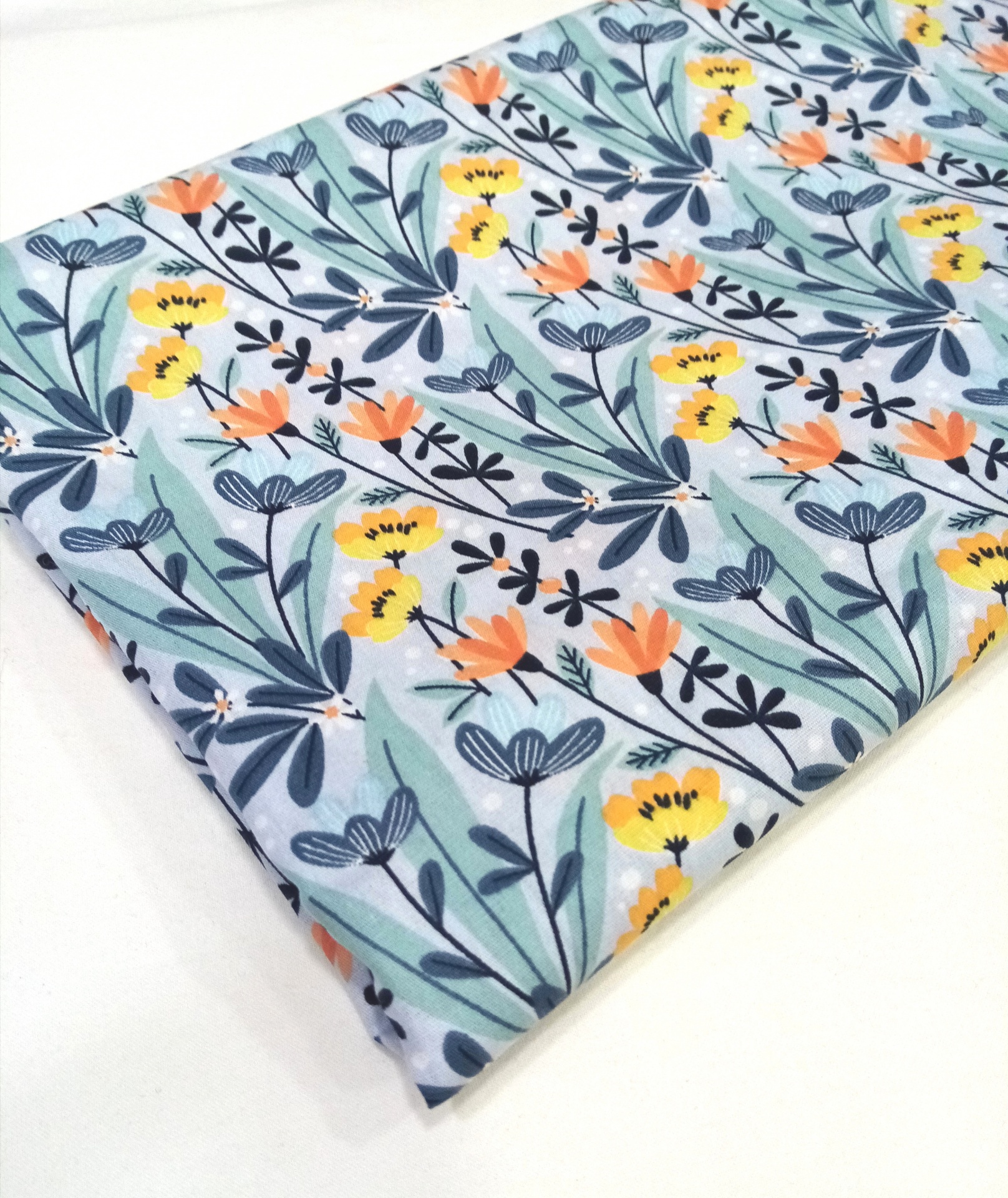 Tricoline Fabricart 100% algodão com flores amarelas, azuis e salmão em fundo azul acinzentado.