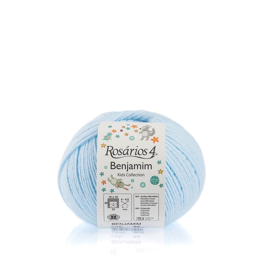Lã Rosários4 Benjamim 04 6,20 € Partilhar Adicionar Contactar 7 unidades em stock Lã Rosários4 Benjamim em azul bebé, cor 04 50% acrílico microfibra, 50% poliamida 100gr, 250m Agulhas 4 ou 4.5
