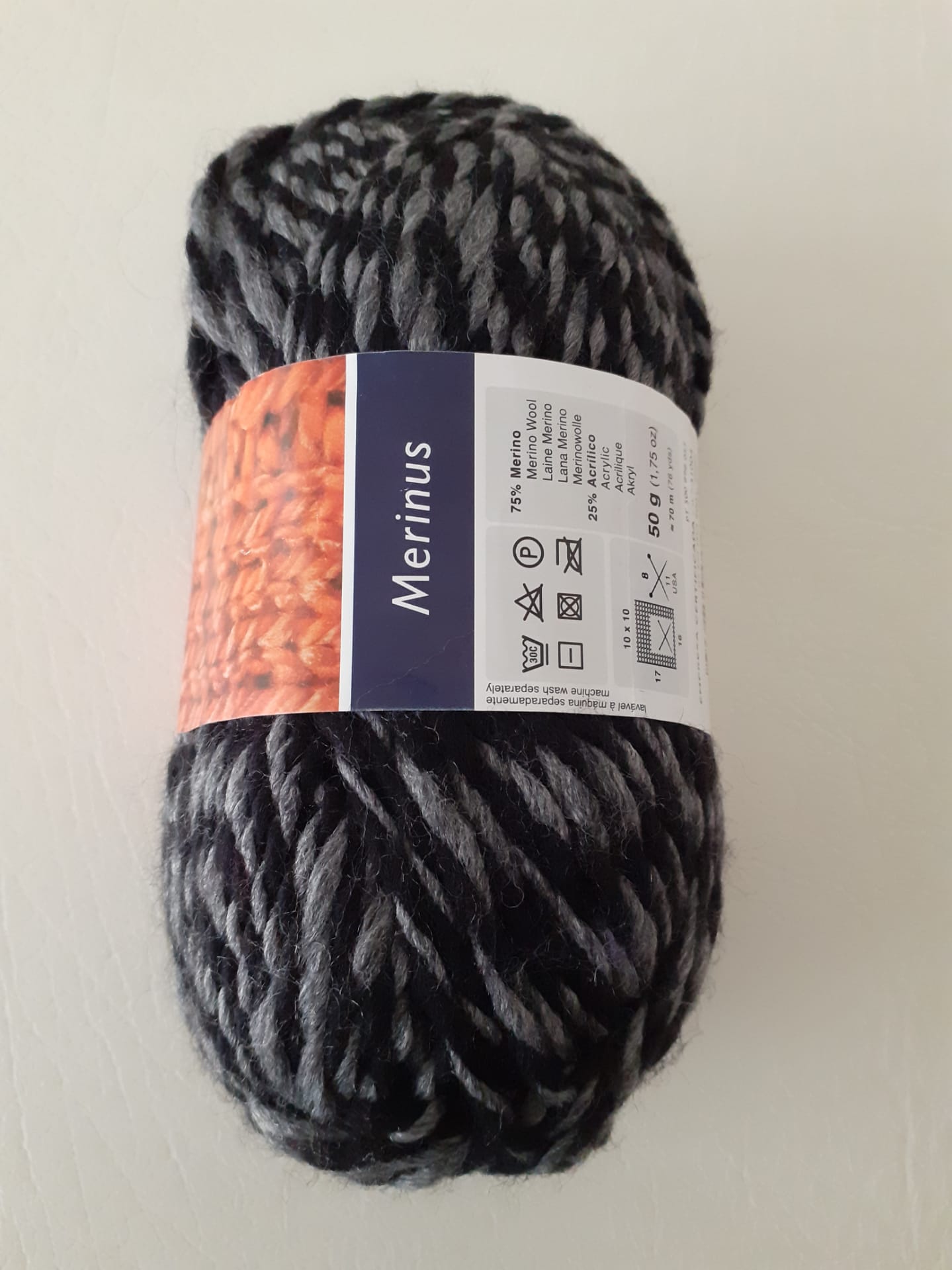Lã Rosários4 Merinus 19 1,60 € Partilhar Adicionar Contactar Lã Rosários4 Merinus matizado em preto e cinza, cor 19 75%Merino, 25% Acrílico 50gr, 70m Agulha 8