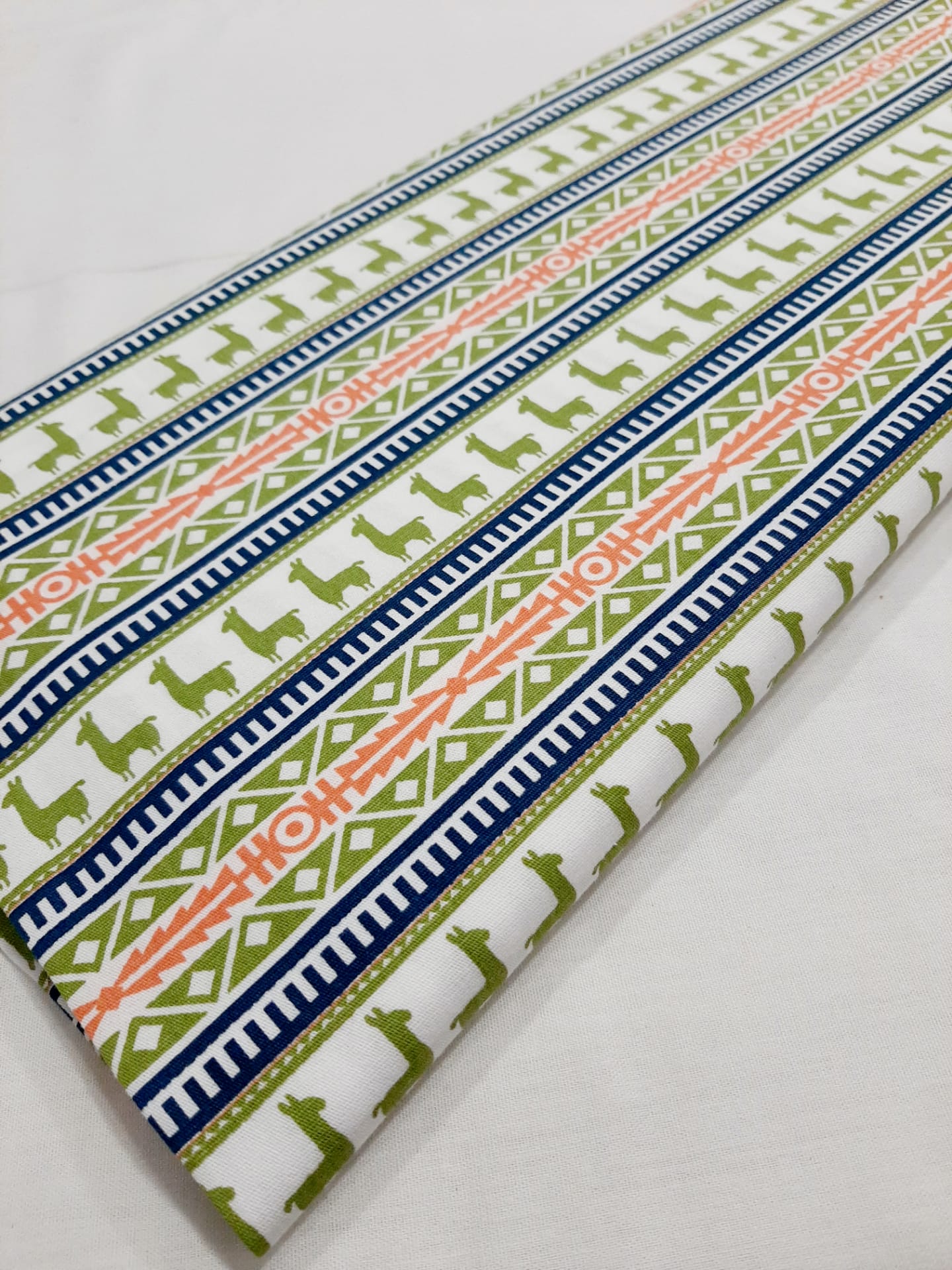 Tecido Fabricart 100% algodão, com padrão de lamas em verde, azul e laranja com fundo branco.