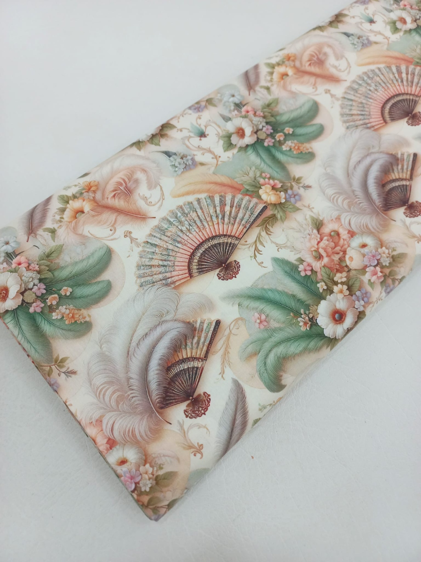 Tricoline 100% algodão, com leques em tons de rosa e verde em fundo pérola.