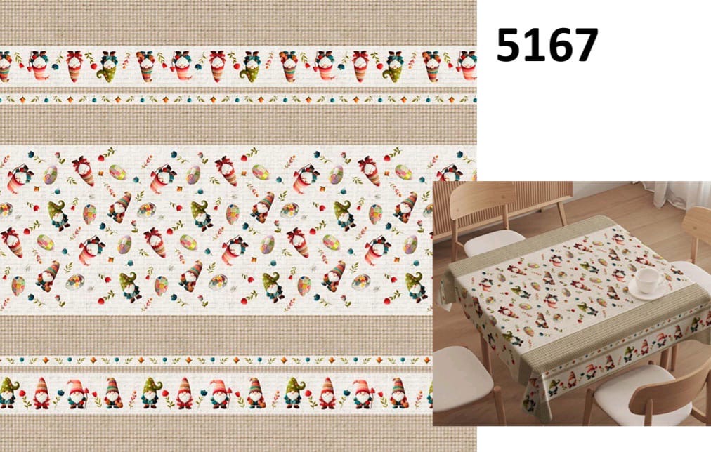 Loneta 50%algodão, 50%poliéster, com duendes e ovos de Páscoa em fundo creme.