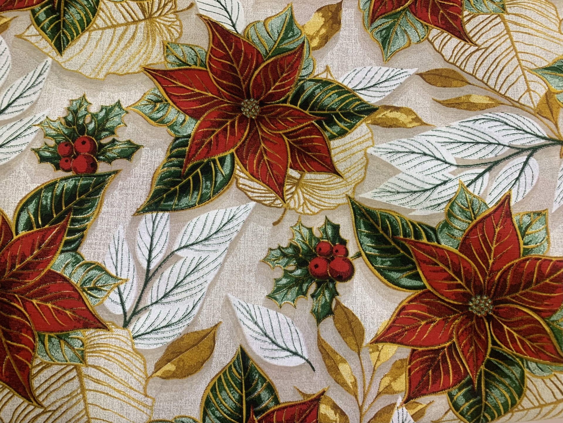 Loneta70% algodão, 30% poliester, com a Flor de Natal em fundo creme.