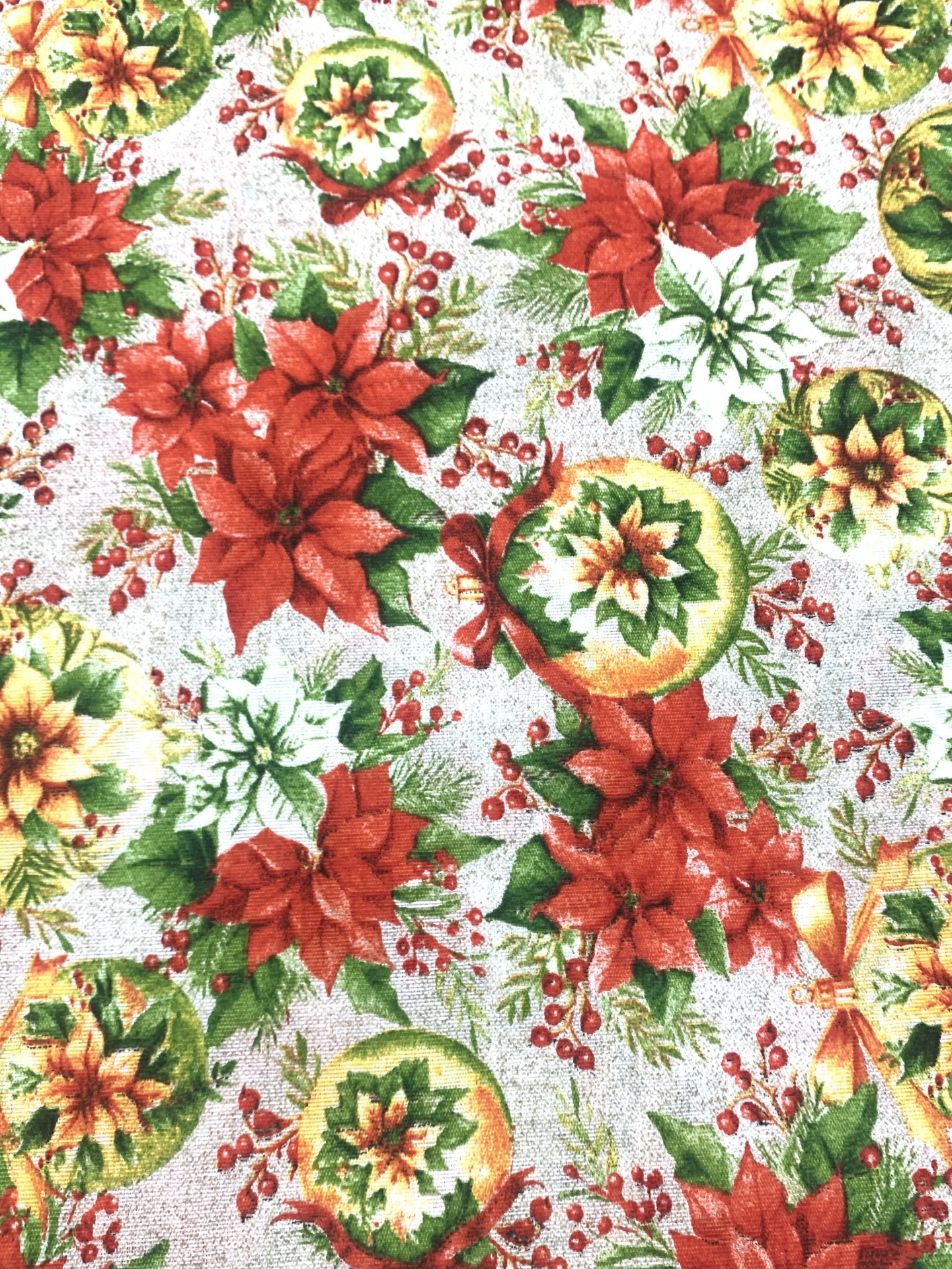 Loneta70% algodão, 30% poliester, com bolas de Natal e poinsêntias.