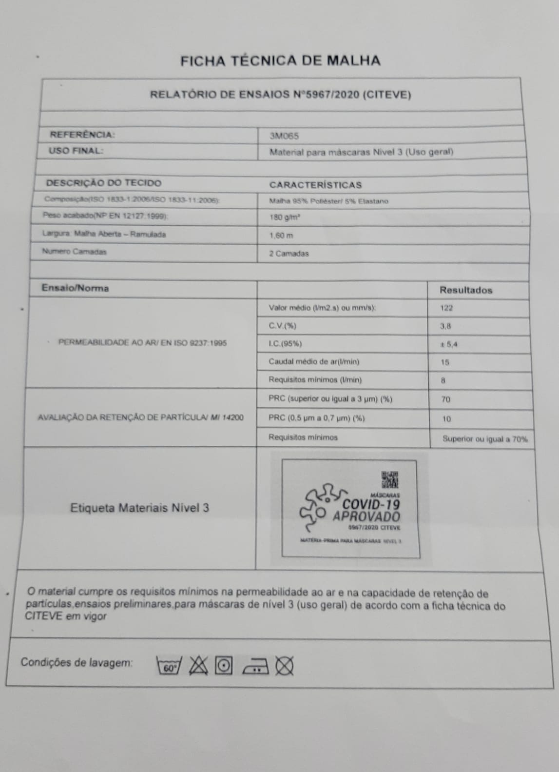 Malha covid para máscaras em branco 0,08 € Partilhar O produto encontra-se sem stock. Tecido protetor e lavável. Encontra-se de acordo com as diretivas da OMS e está aprovado pelo citeve. 1.50m de largo Corte mínimo 20cm