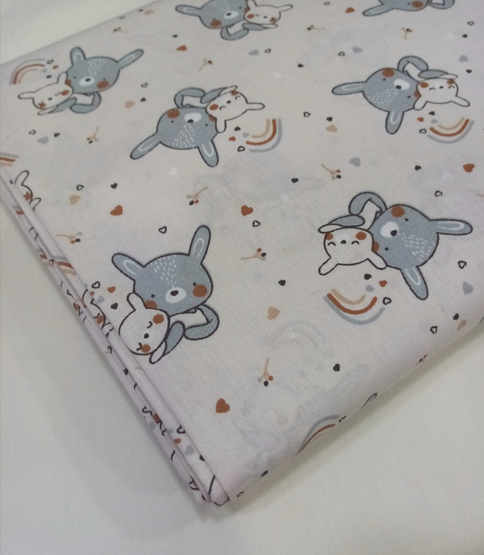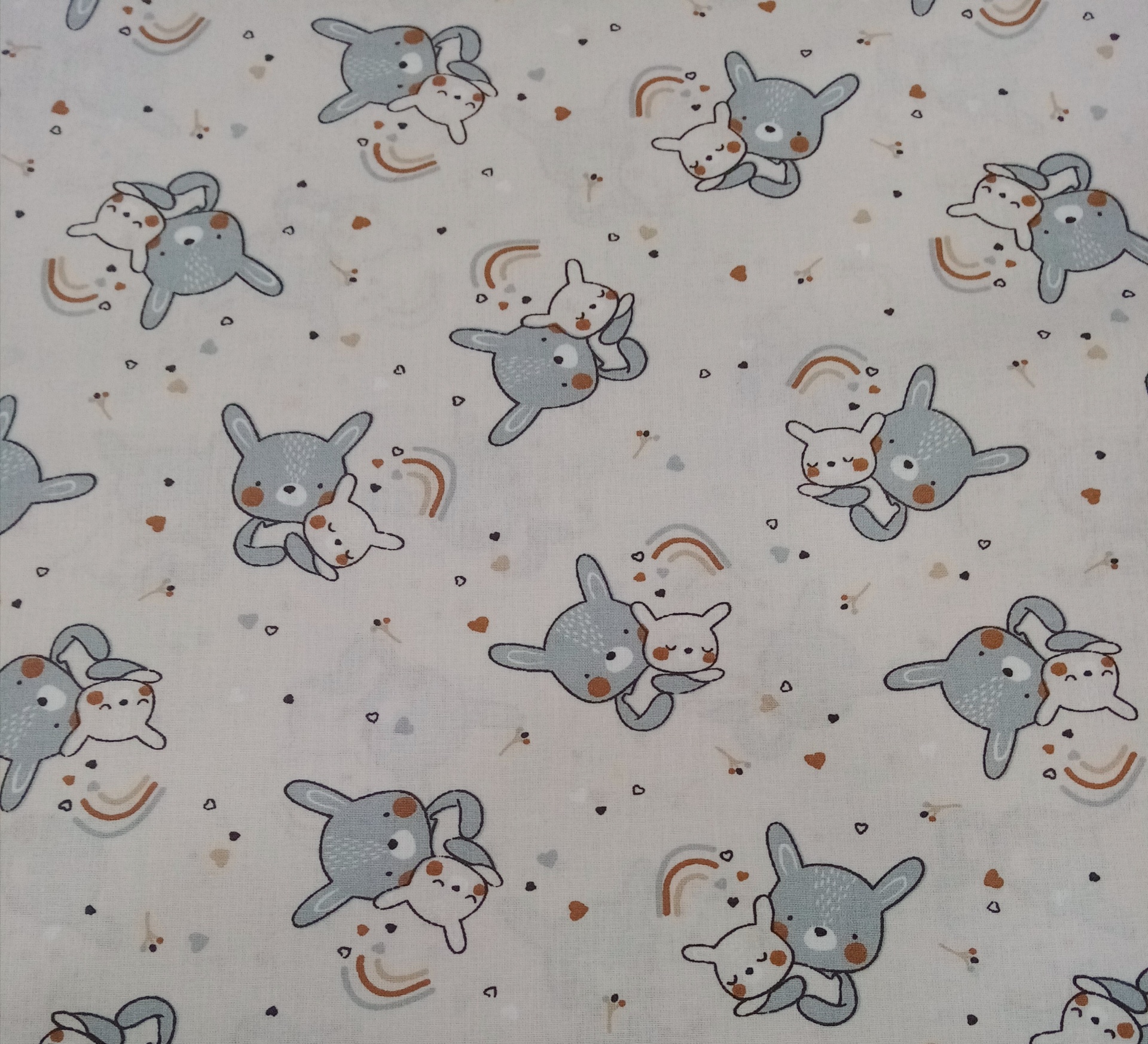 Popeline Le Tissu by Domotex 100% algodão com coelhinha e o seu bebé em fundo creme claro.