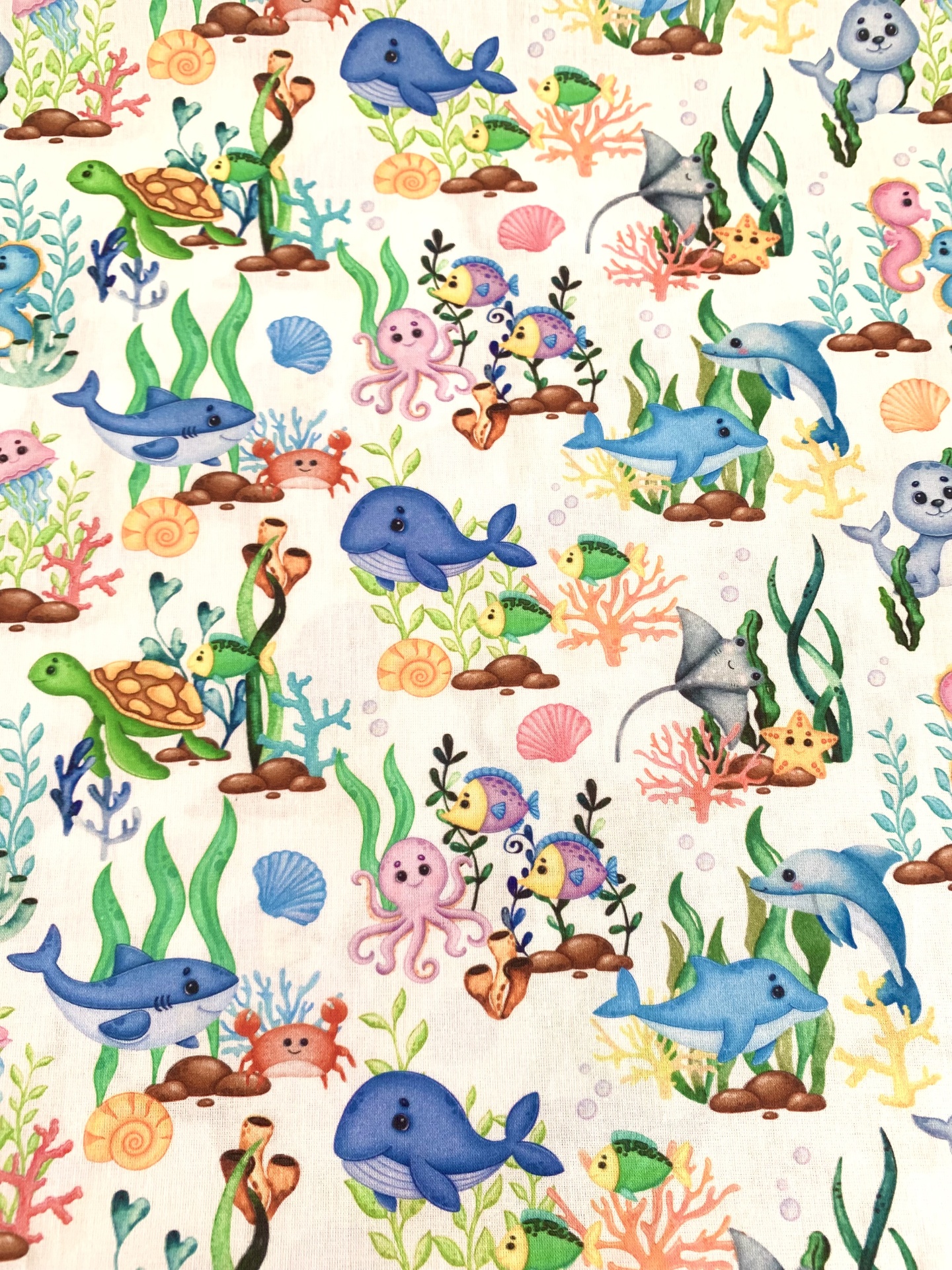 Percal 100% algodão com animais marinhos em fundo branco.