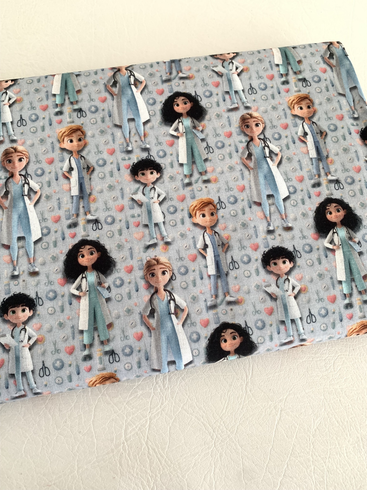 Tecido 100% Algodão, com profissionais de saúde em fundo azul acinzentado.