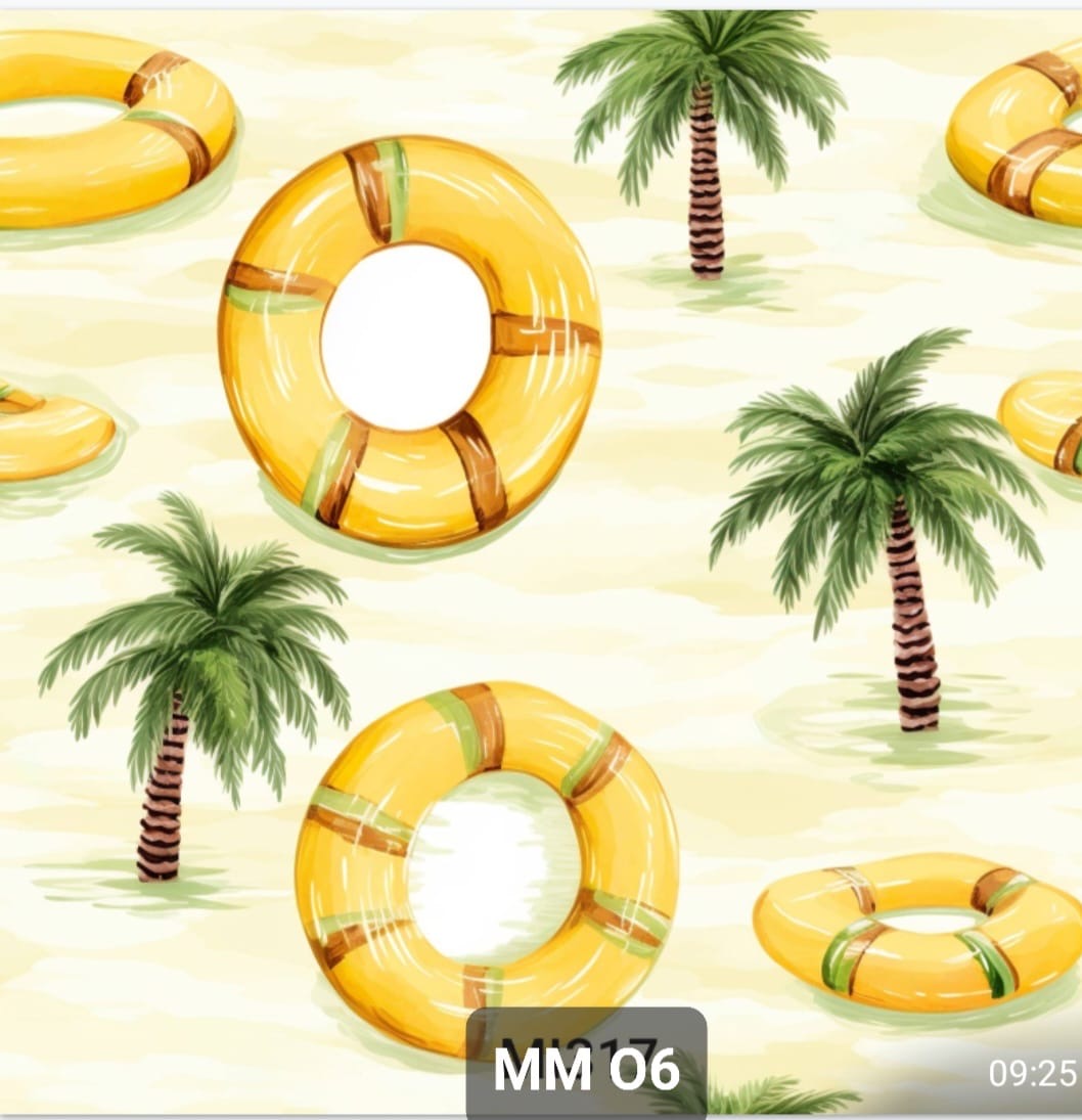 Tecido minimate impermeável, com bóias de praia e palmeiras em fundo pérola.