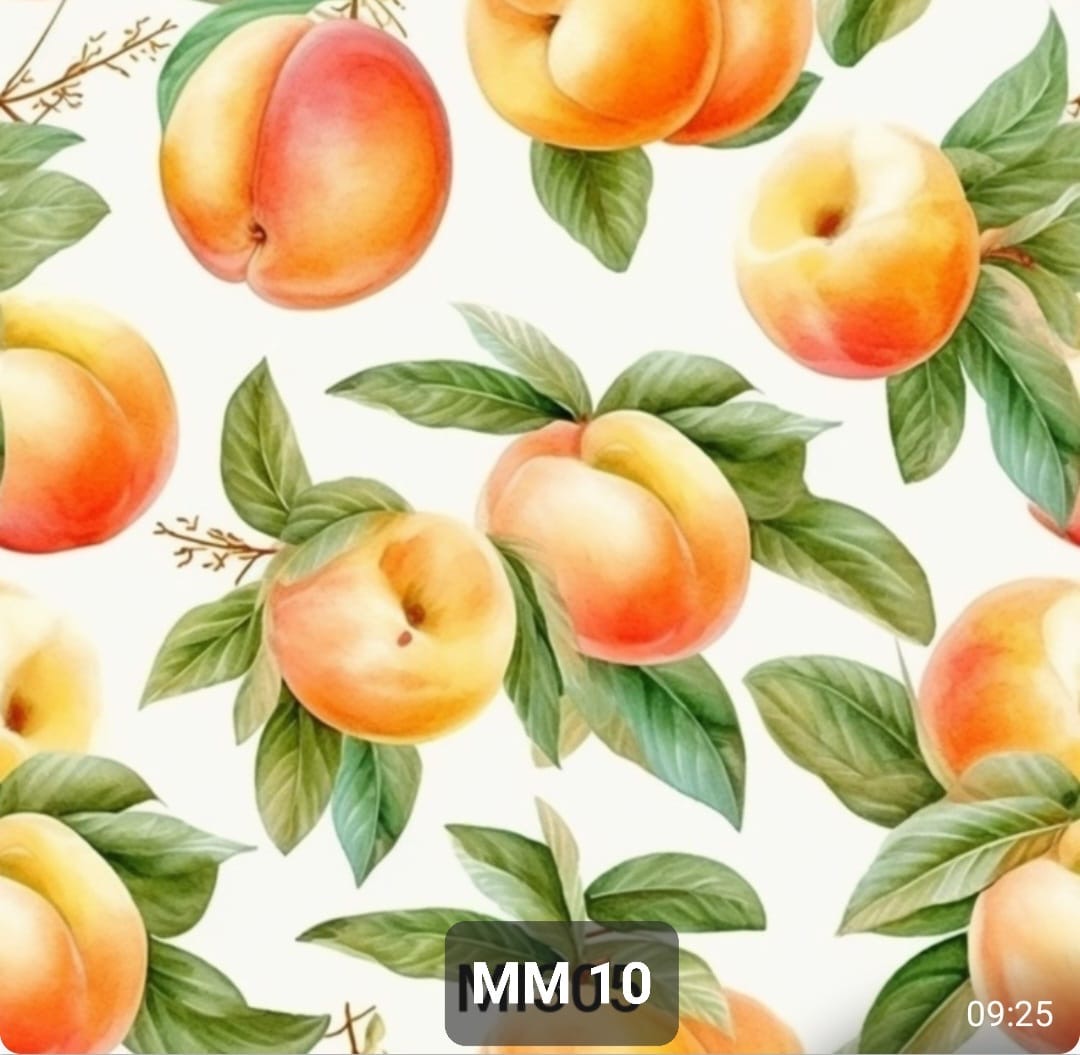 Tecido minimate impermeável, com pêssegos em fundo branco.