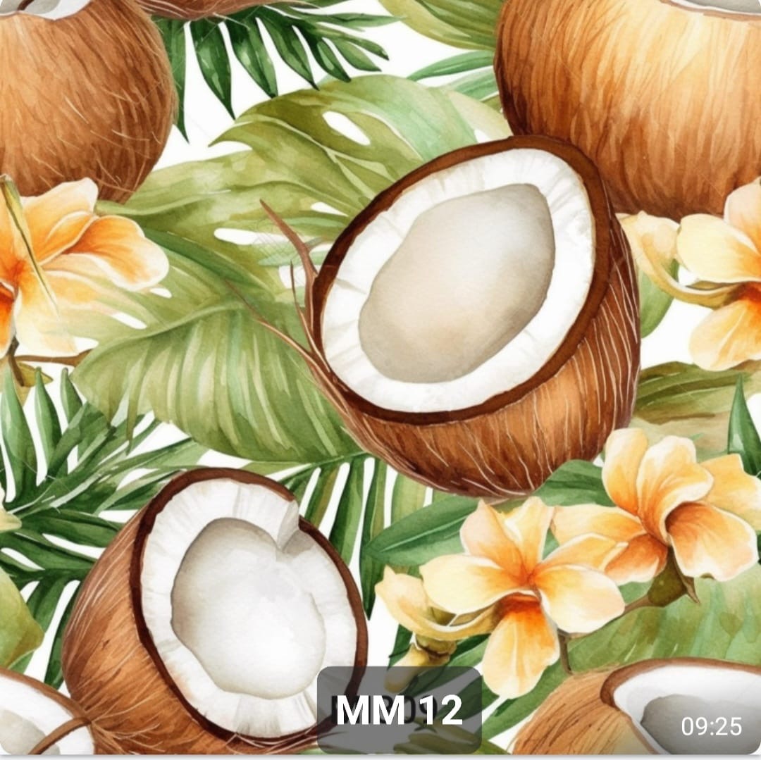 Tecido minimate impermeável, com cocos em fundo branco.