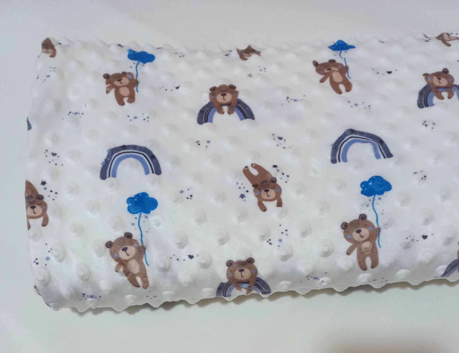 Tecido Minky 100% poliéster com ursinhos,balões e arco-íris em tons de azul em fundo branco muito fofinho com um toque semelhante ao veludo, indicado para bebés, confeção de mantas, capa de edredons e almofadas