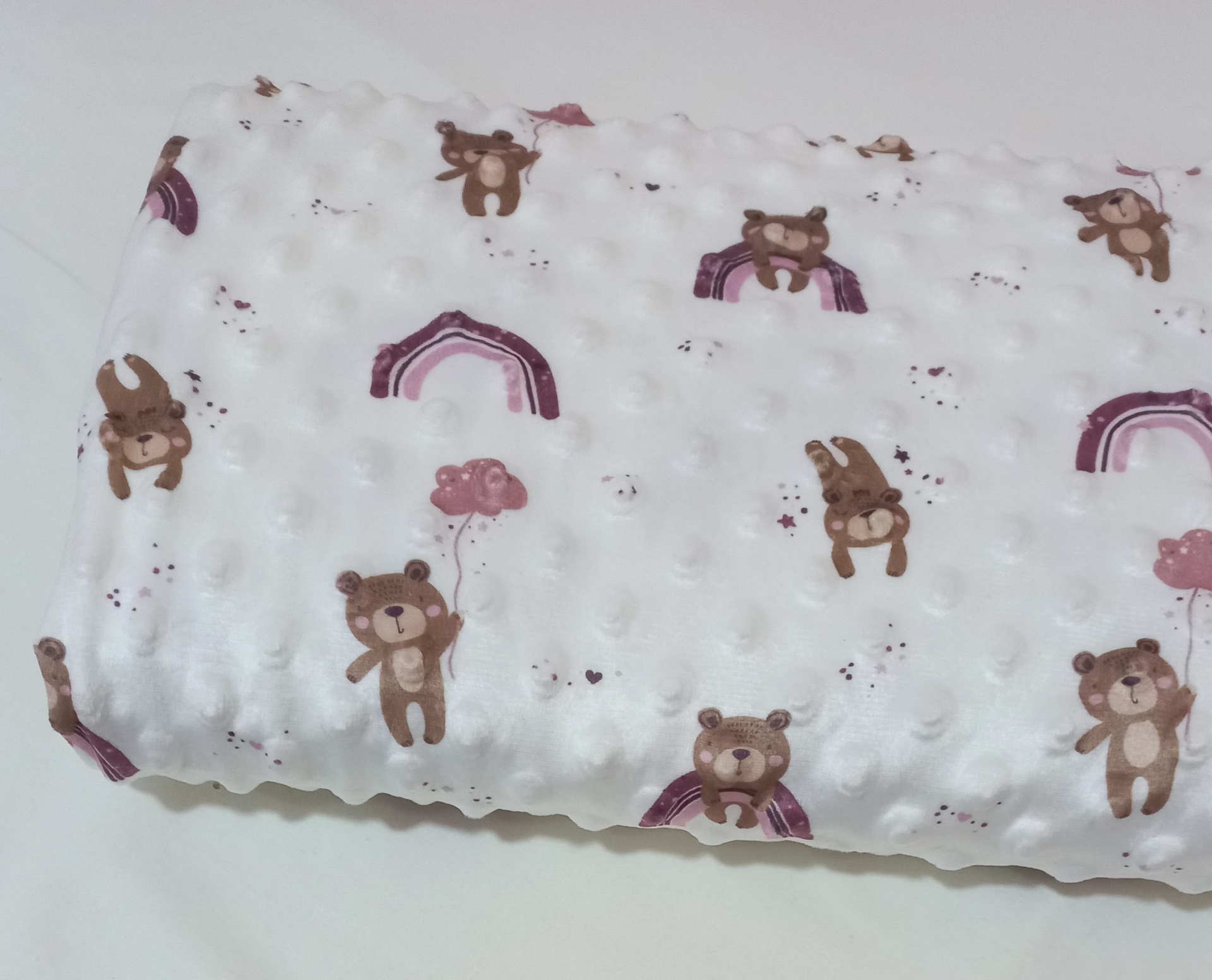 Tecido Minky 100% poliéster com ursinhos,balões e arco-íris em tons de rosa velho em fundo branco muito fofinho com um toque semelhante ao veludo, indicado para bebés, confeção de mantas, capa de edredons e almofadas