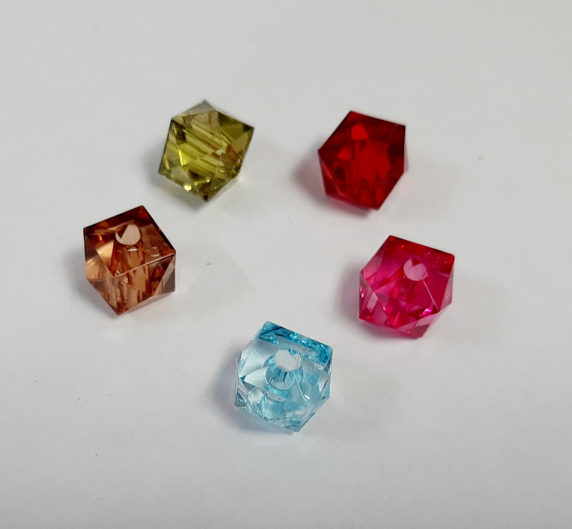 Missanga Cúbica Pequena 0,10 € Partilhar Cor Verde Castanho Vermelho Rosa Azul Adicionar Contactar 10 unidades em stock Missanga de plástico em forma de cubo com pirâmides 9mm de lado