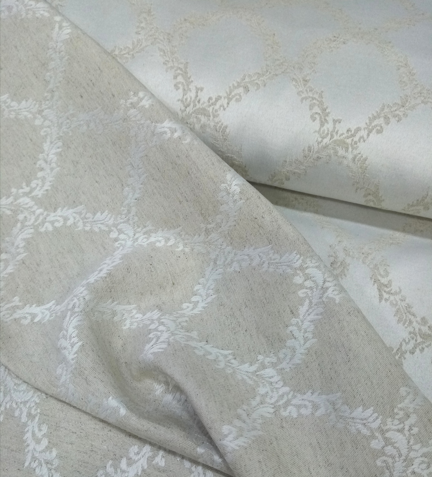 Brocado 30%algodão , 15% linho , 55% poliéster com losangos grandes beges em fundo pérola e no verso losangos pérola em fundo bege.