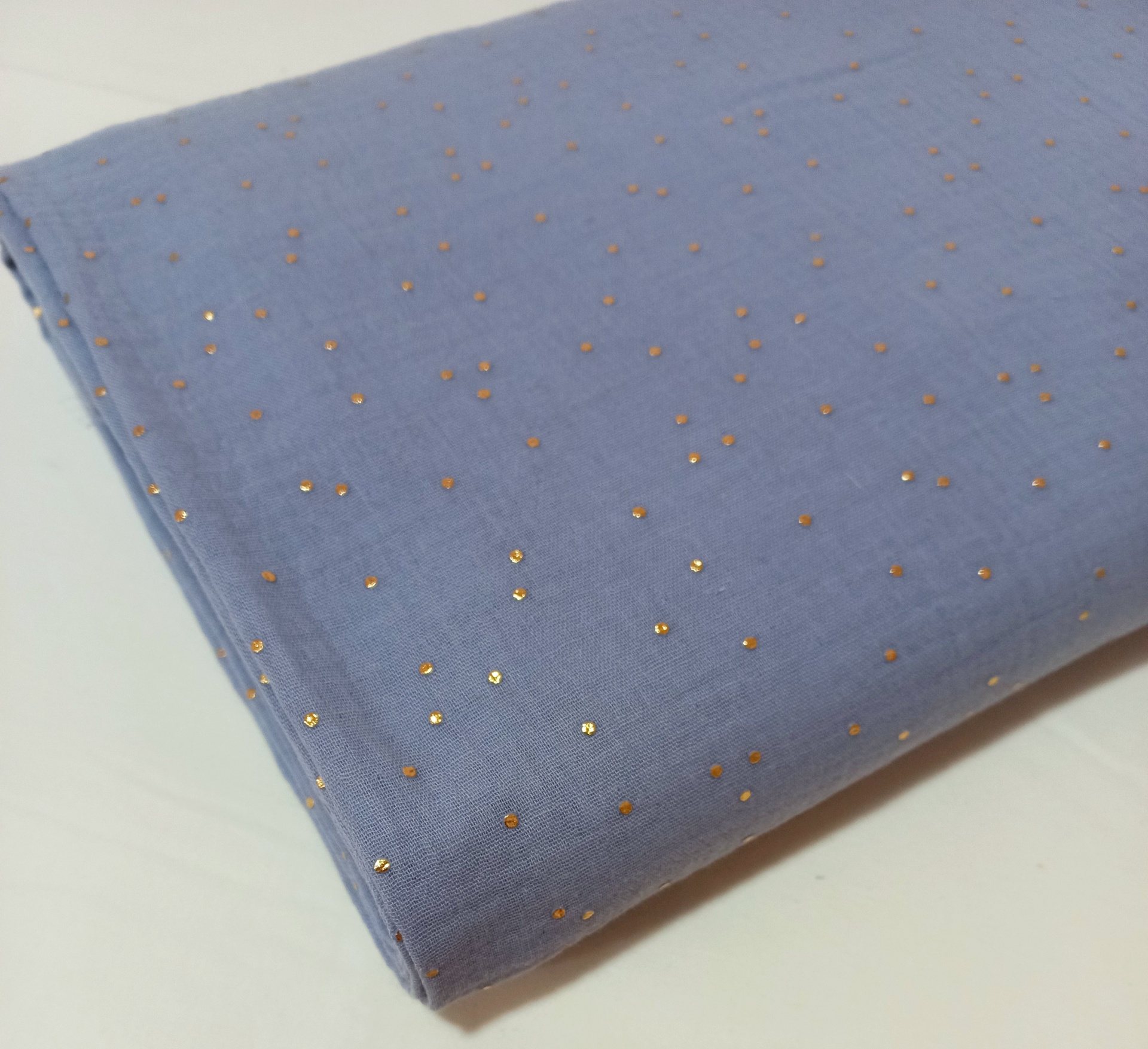 Musselina azul acinzentado com pintas douradas