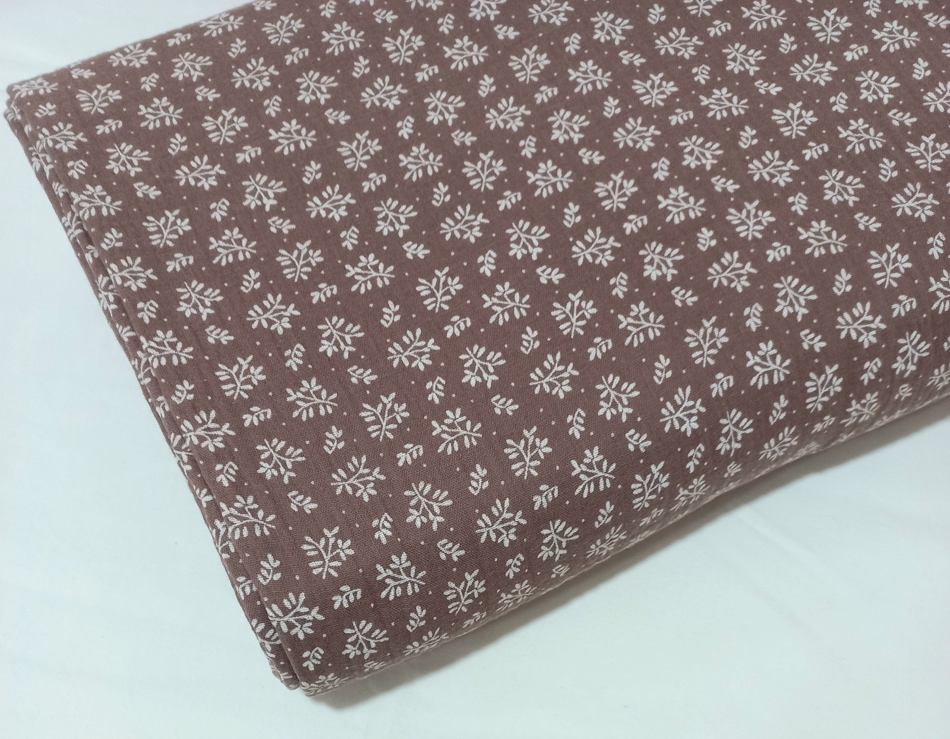 Tecido musselina 100% algodão com raminhos brancos em fundo castanho.