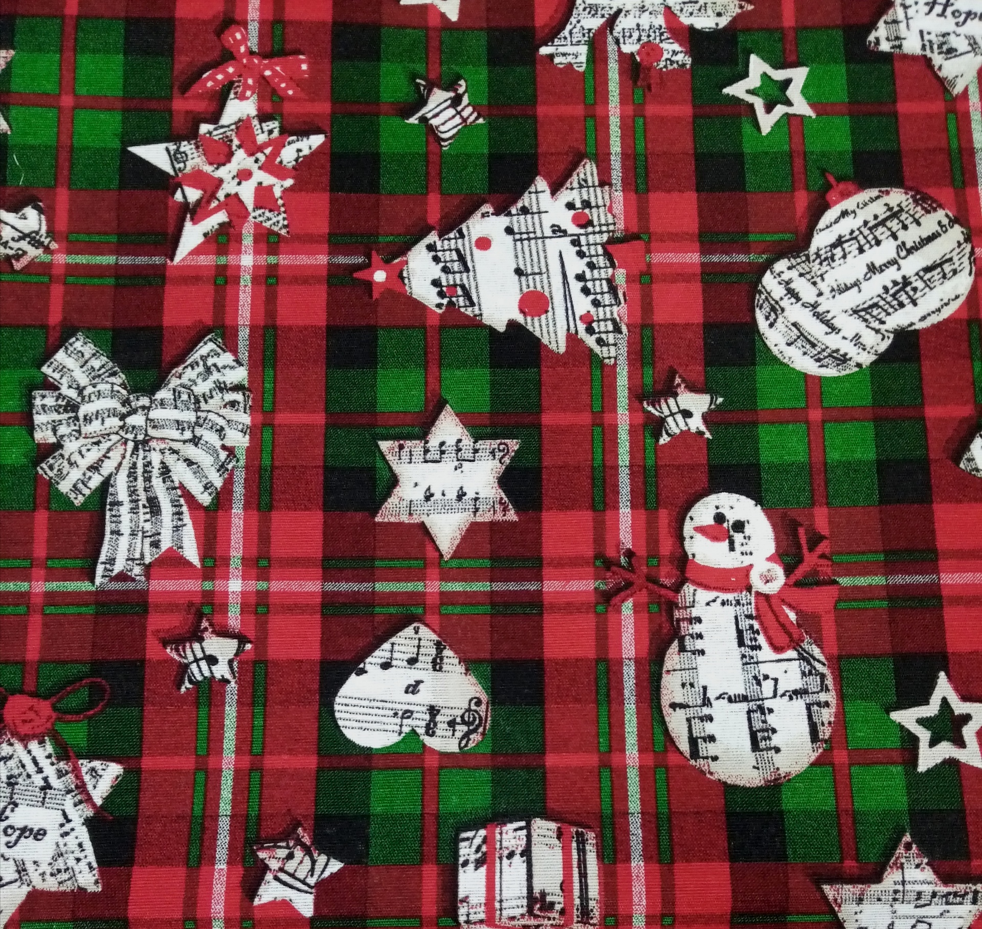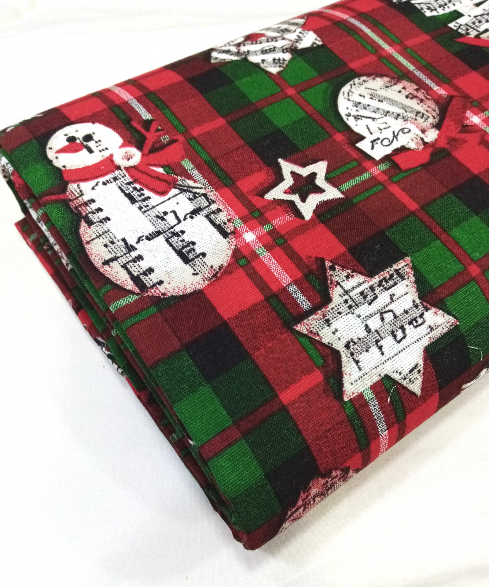 Loneta70% algodão, 30% poliester, com bonecos de neve e arvores de Natal em fundo aos quadrados verdes e vermelhos.
