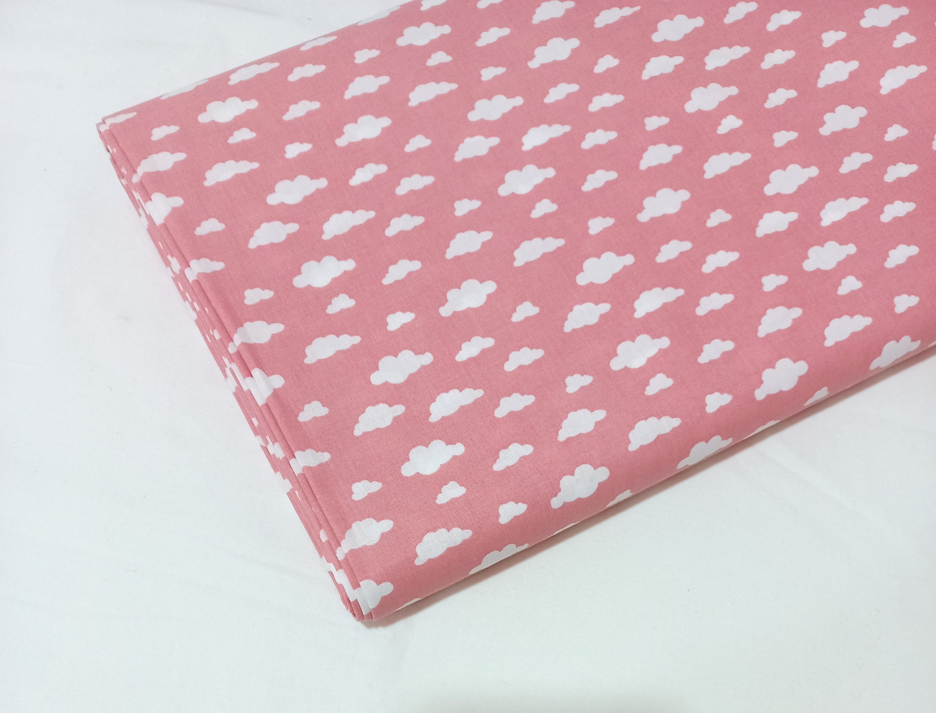 Popeline Domotex 100% algodão com nuvens brancas em fundo coral.