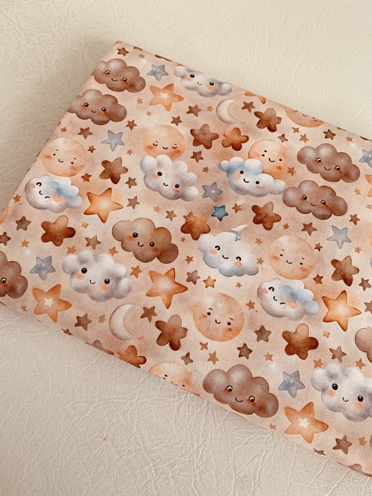 Tecido 100% Algodão , com nuvens e luas em fundocreme. .