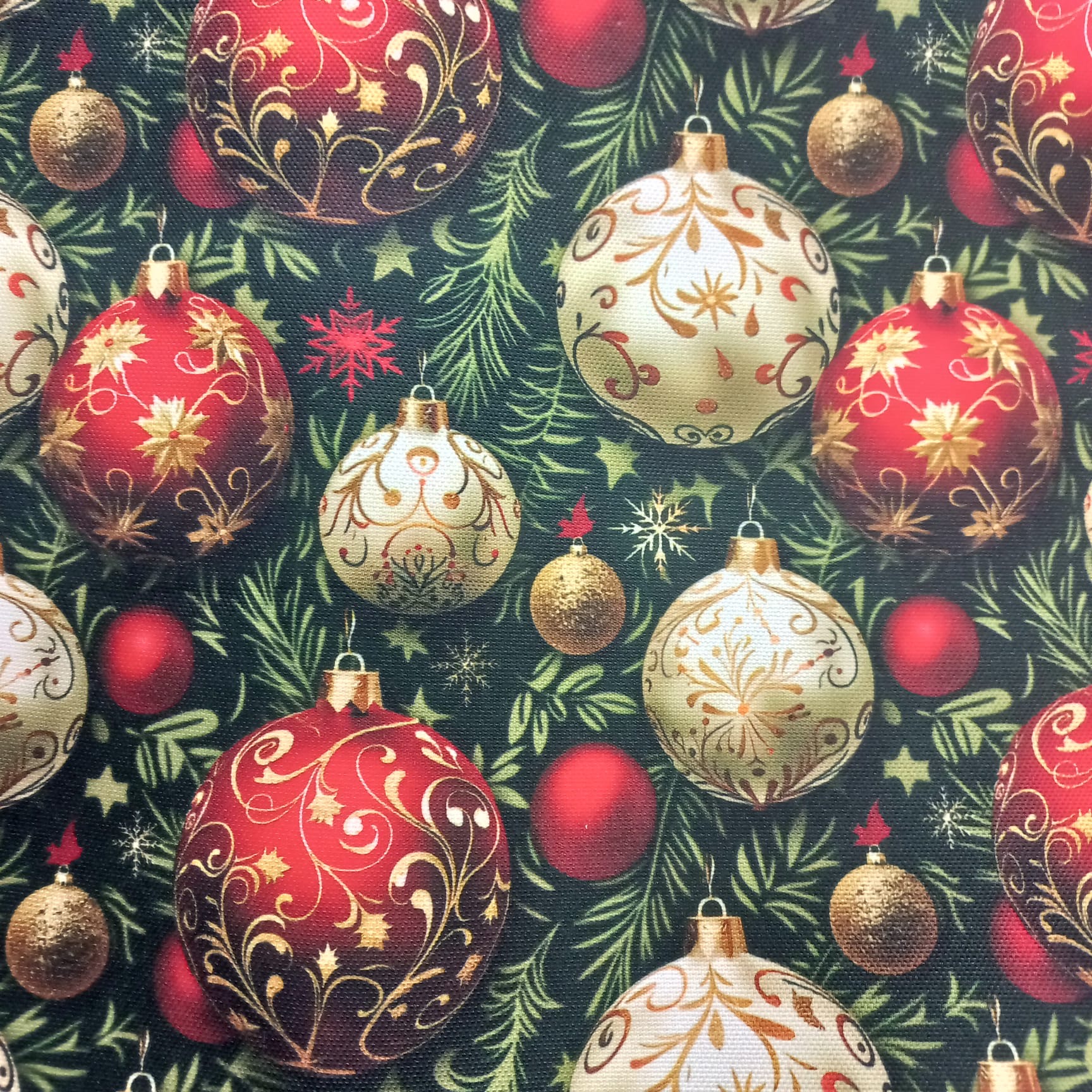 Panamá 100% poliéster, com bolas de Natal em fundo verde escuro.