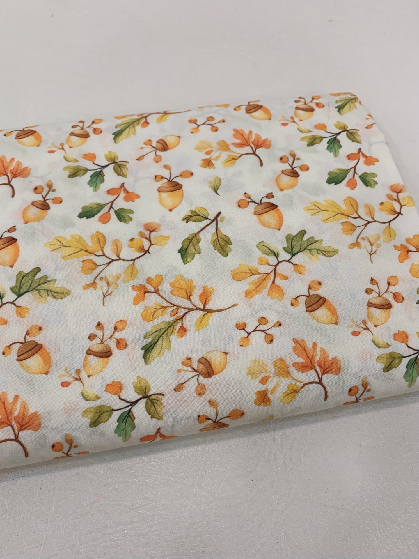 Percal 100% algodão com flores em tons de abóbora, amarelo e verdes em fundo pérola.