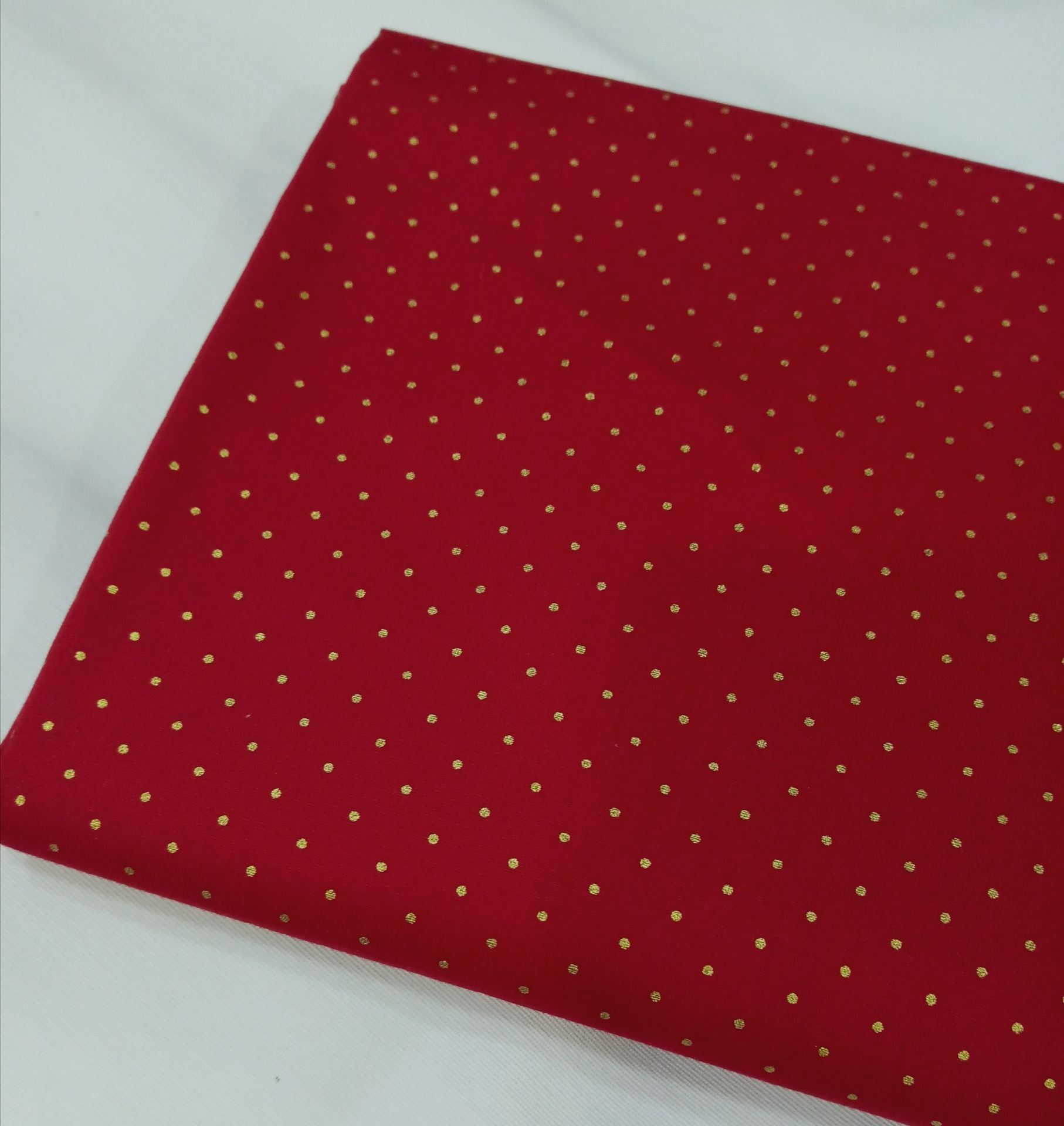 Popeline 100% algodão, com pintinhas douradas com fundo vermelho.